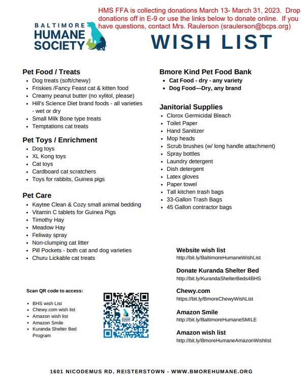 Students in the FFA Club are collecting donations for the Baltimore Human Society from 3/13- 3/31 2023.