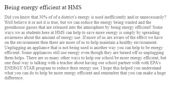 Students performed an energy audit. Students surveyed classrooms at the end of the school day to see if the lights were left on or if they were turned off.
