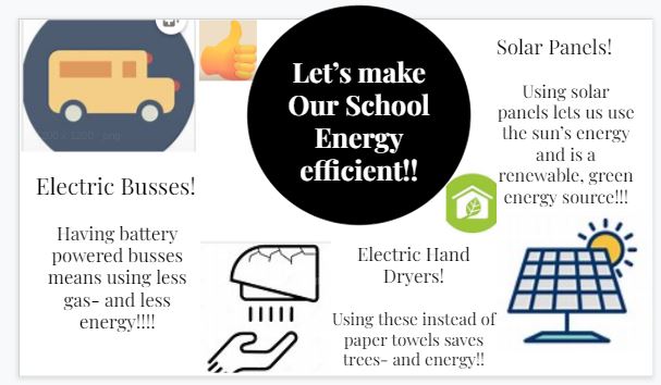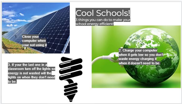 Students in 7th Grade Science researched energy transformations and energy efficient buildings. Students completed an energy efficiency research project, Discovery Education Lab and created public service announcements and posters to promote saving energy in our school building. Students' PSAs included suggestions for students to help save energy in our school.