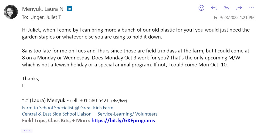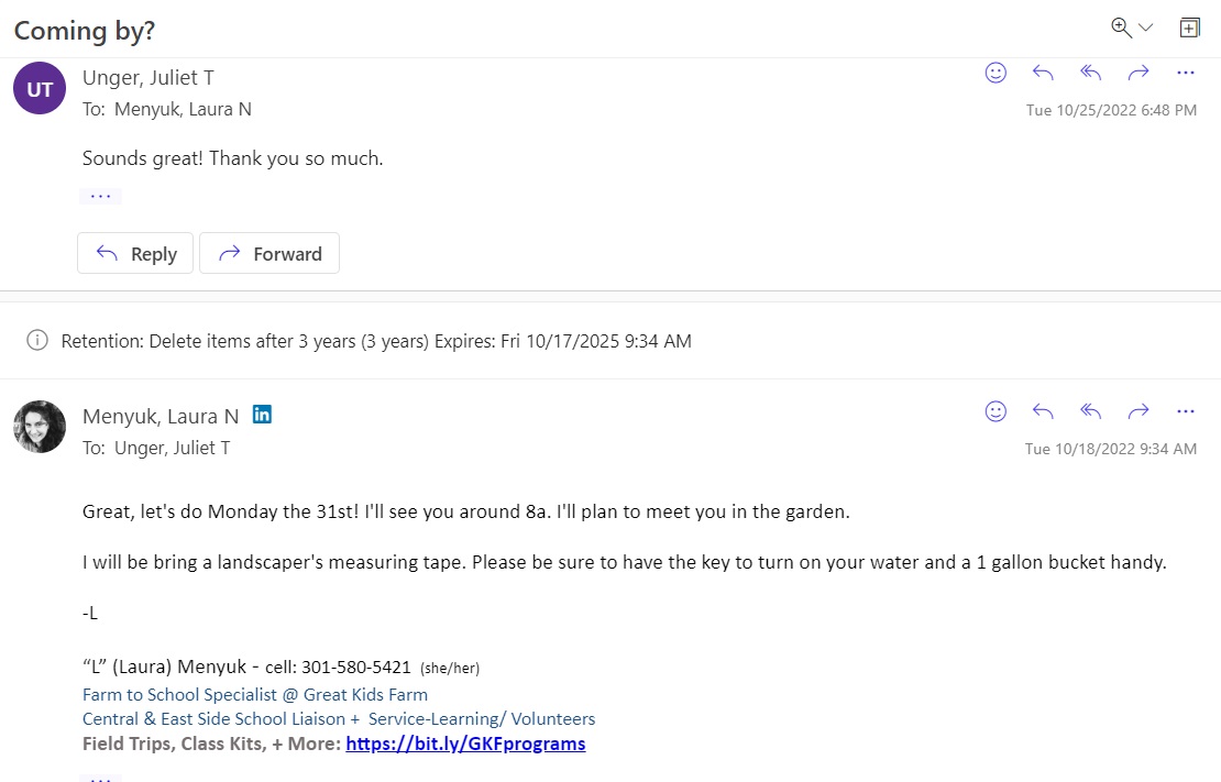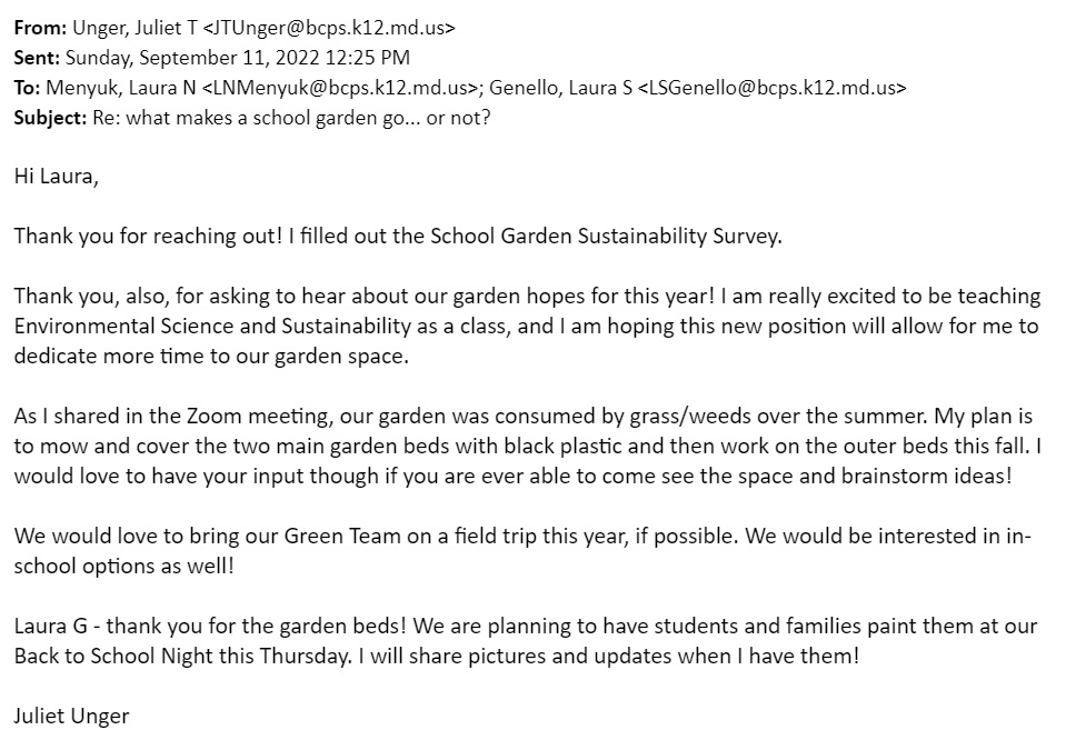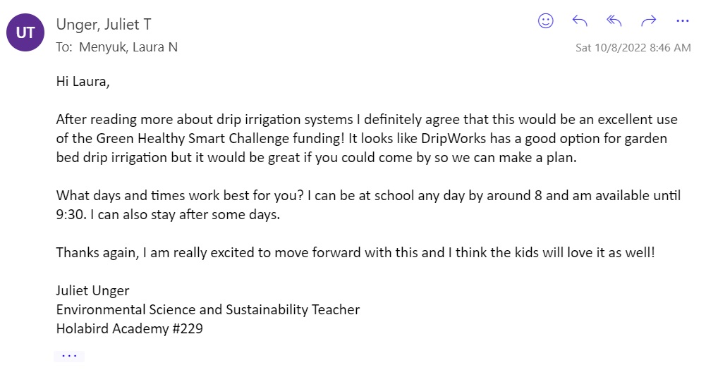 This email reflects consistent communication between Great Kids Farm and Holabird Academy. In this set of emails, a time is being set up for Laura to come to Holabird to work with the school's Green Team coordinator to create a plan to install an irrigation system in the school's garden.