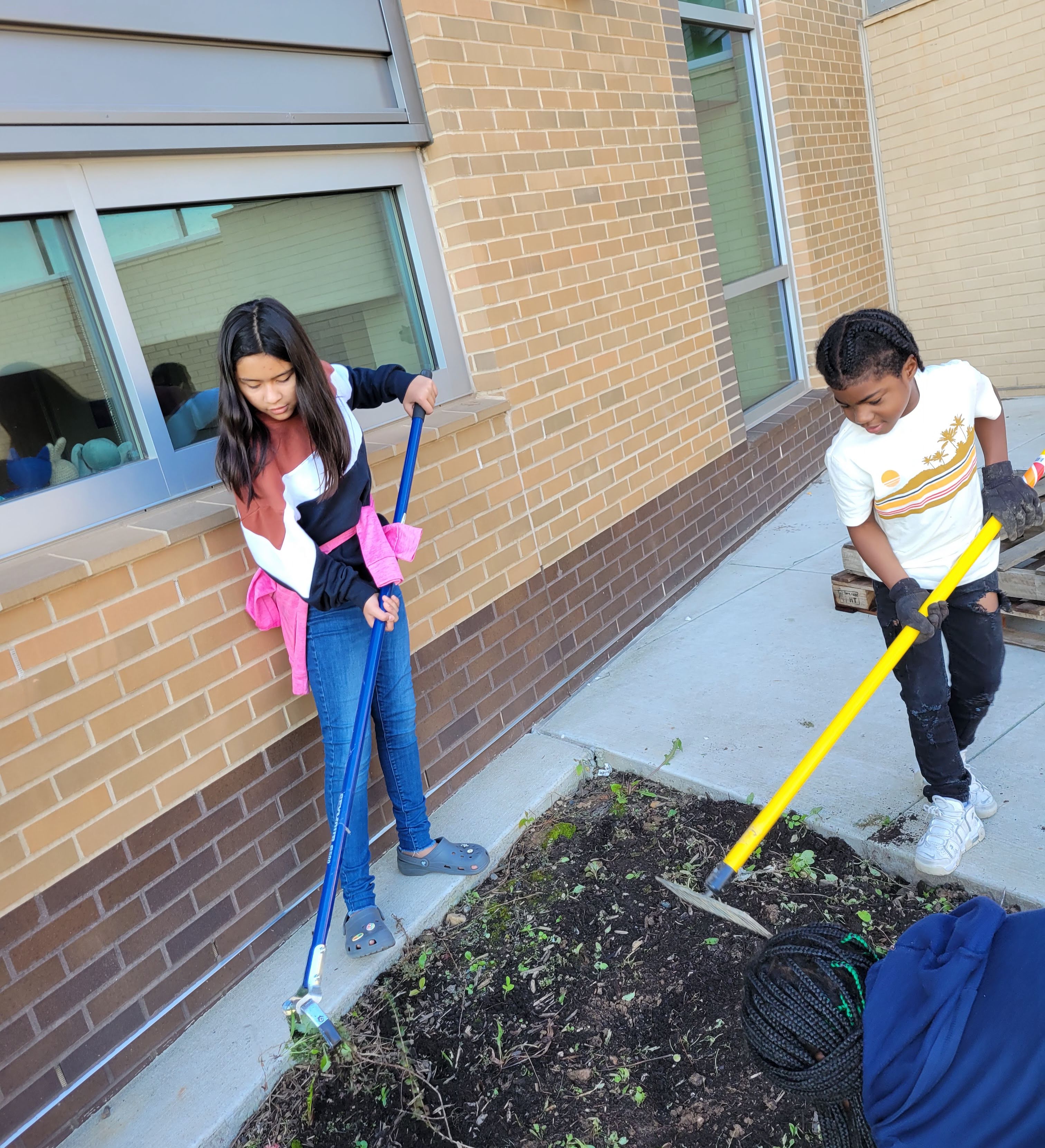 These students are working together to weed and aerate the soil in one of the garden beds.