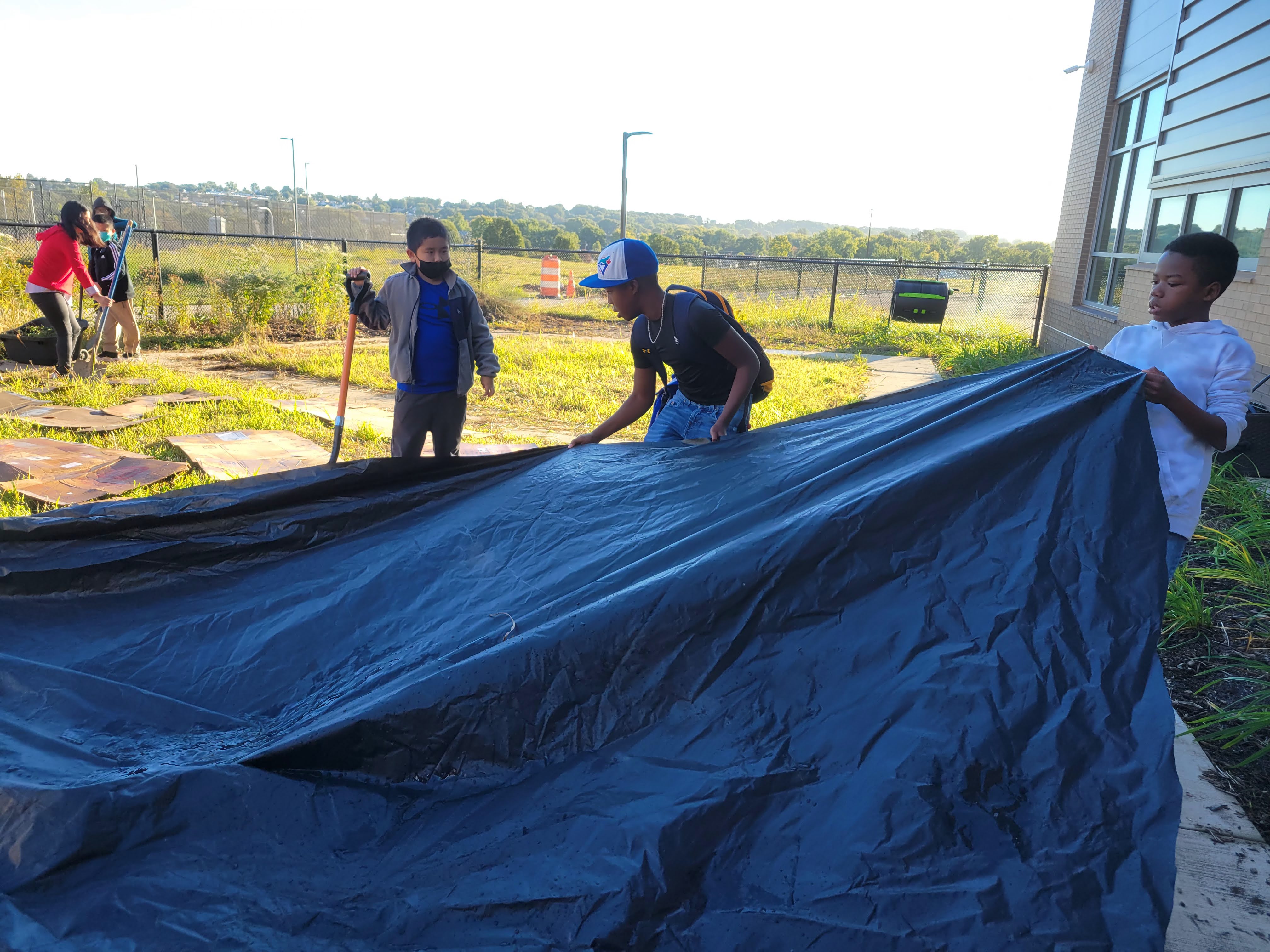 This picture shows students covering the vegetable beds with plastic for the winter.