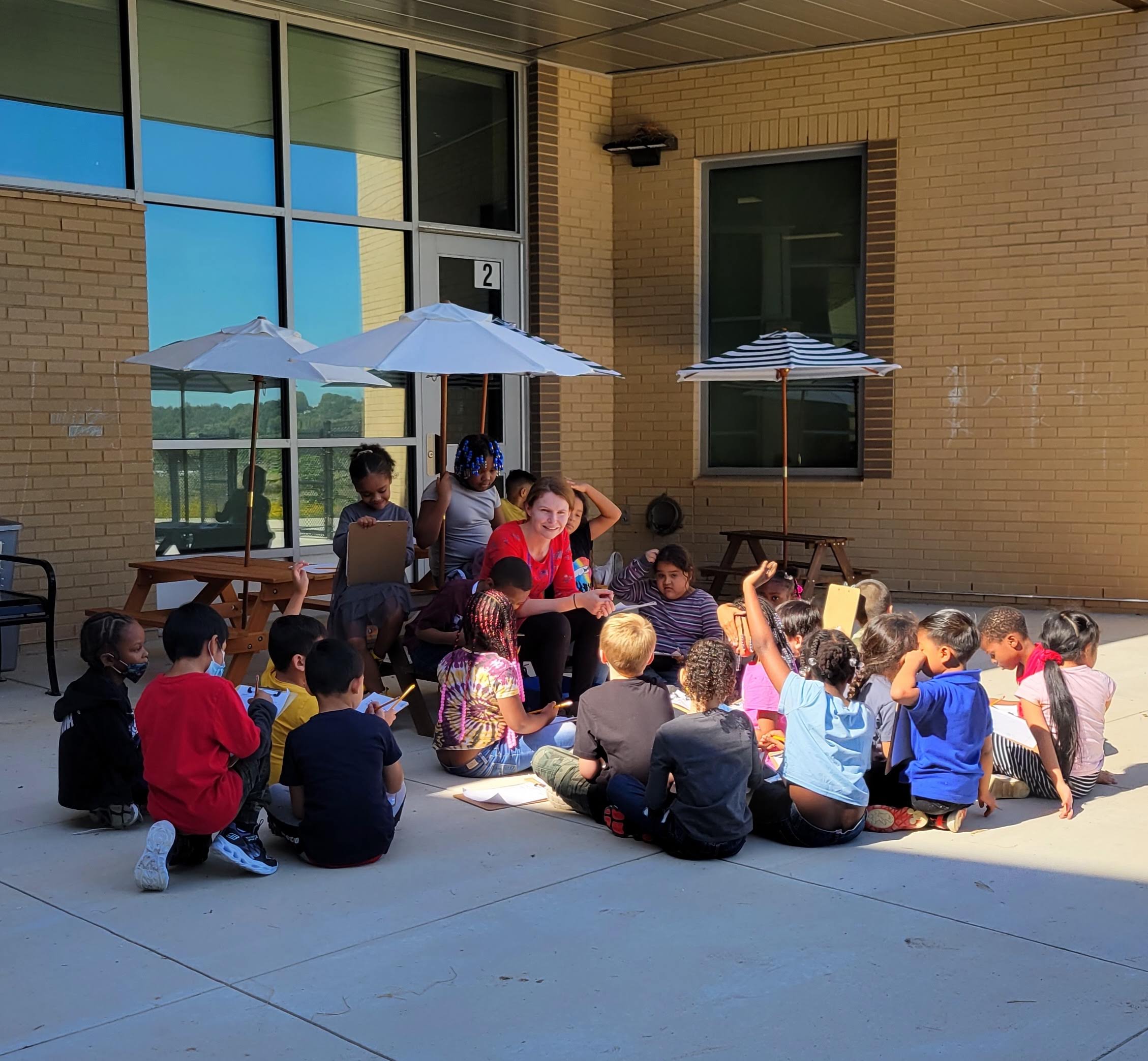This is a picture of first grade students using picnic tables in the garden to draw what they observed in their environment.