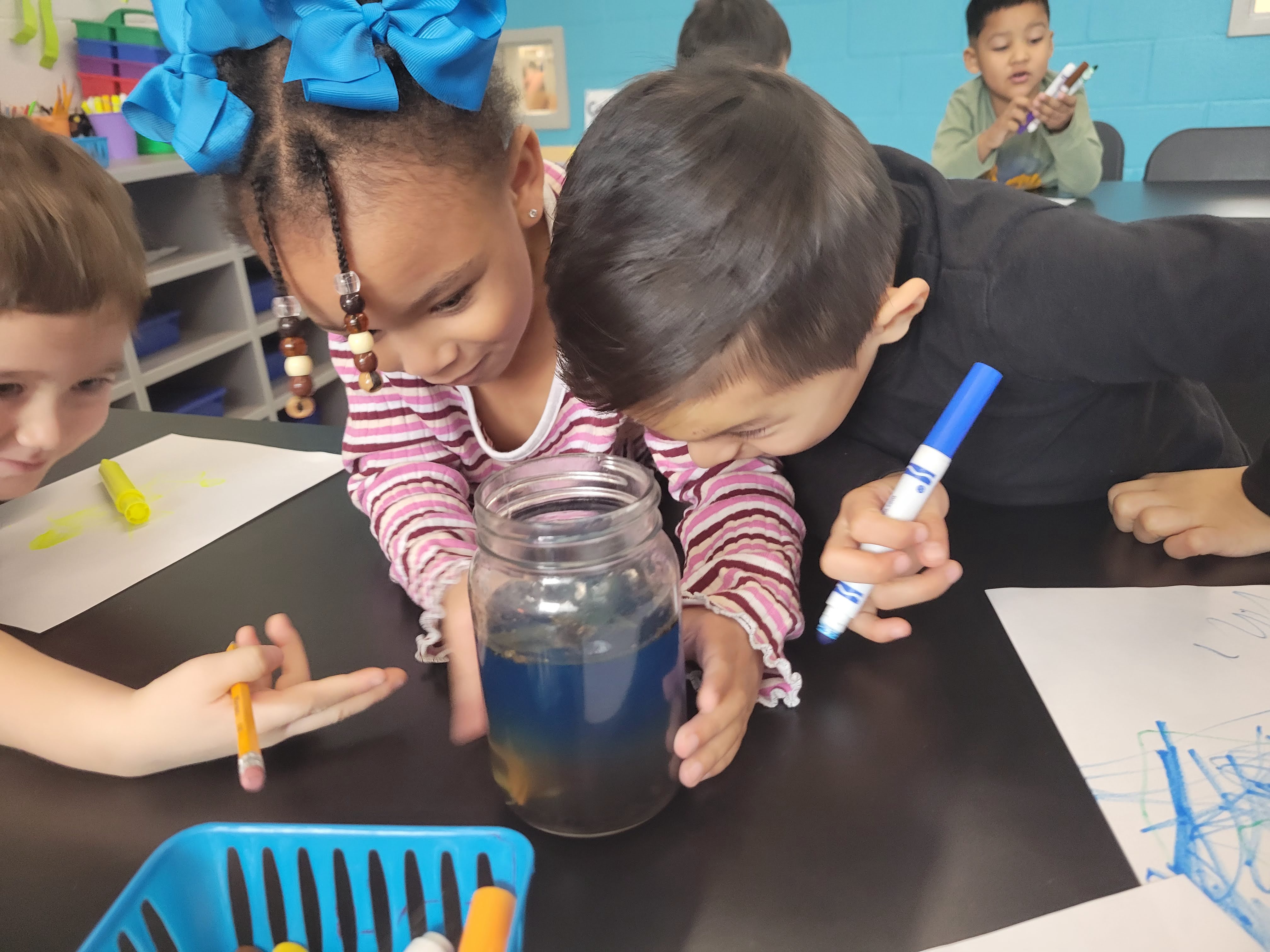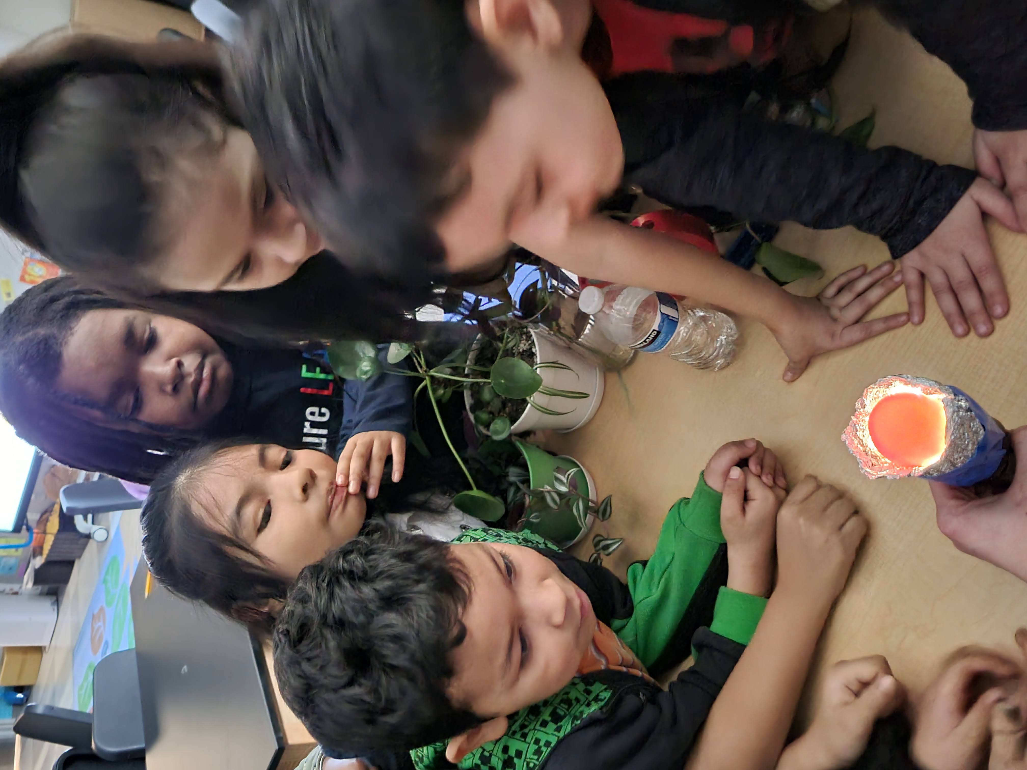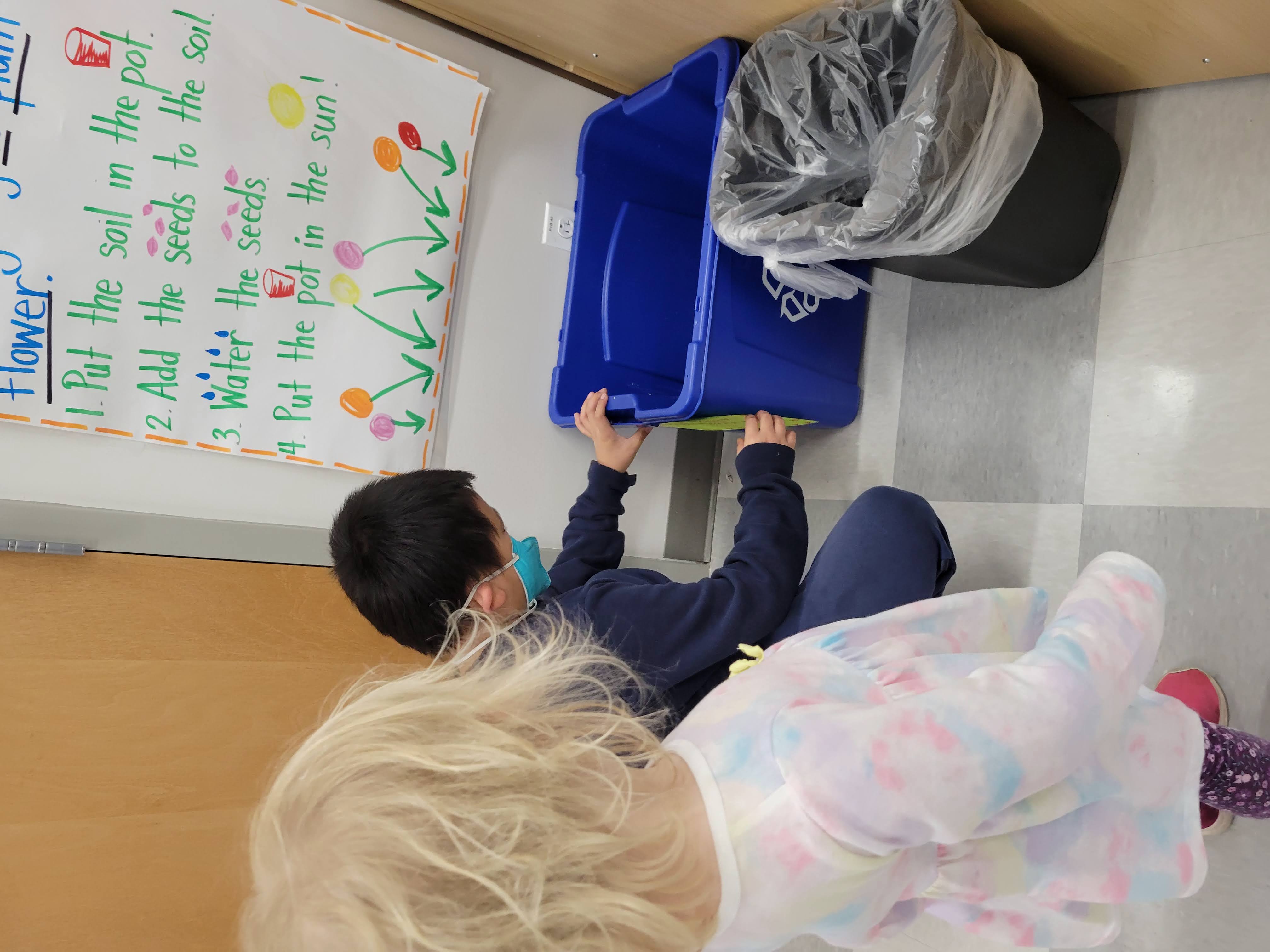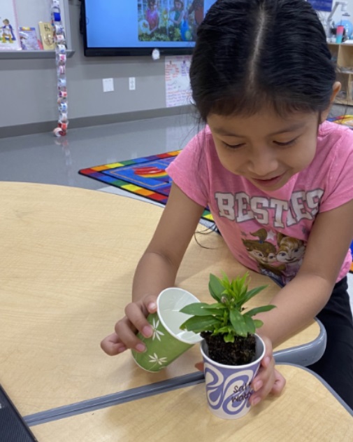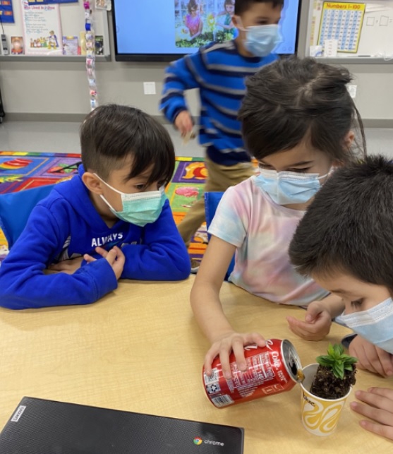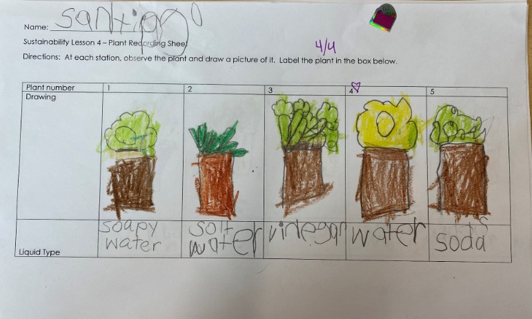 Students engaged in a long-term project by adding different liquids to different plants over time and observing how each plant changed based on the liquid it received. Students recorded their findings and discussed why water is important, how plants grow, and why it is important to be sustainable.