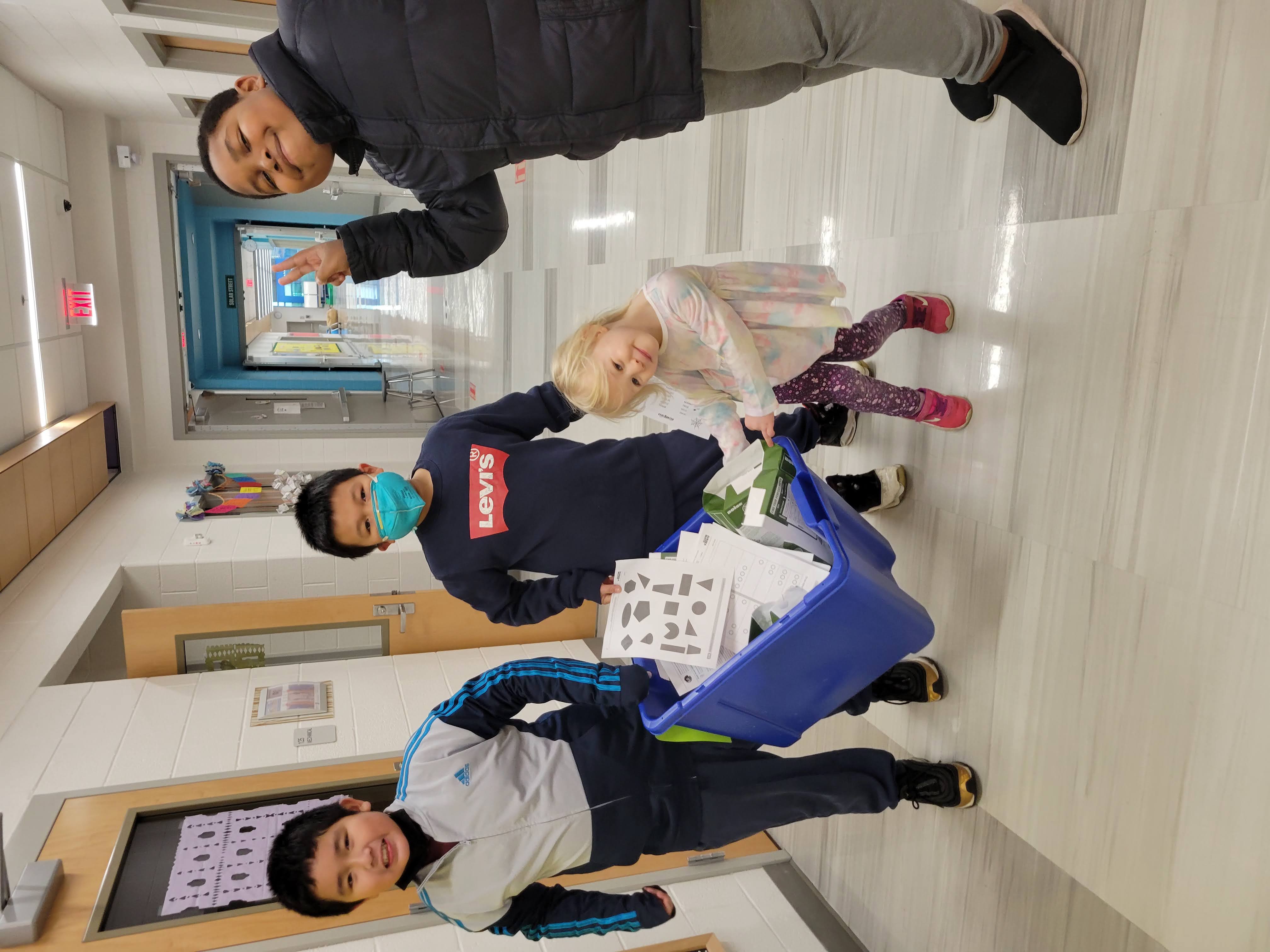 This picture shows students on the Green Team working together to collect recycling from classrooms.