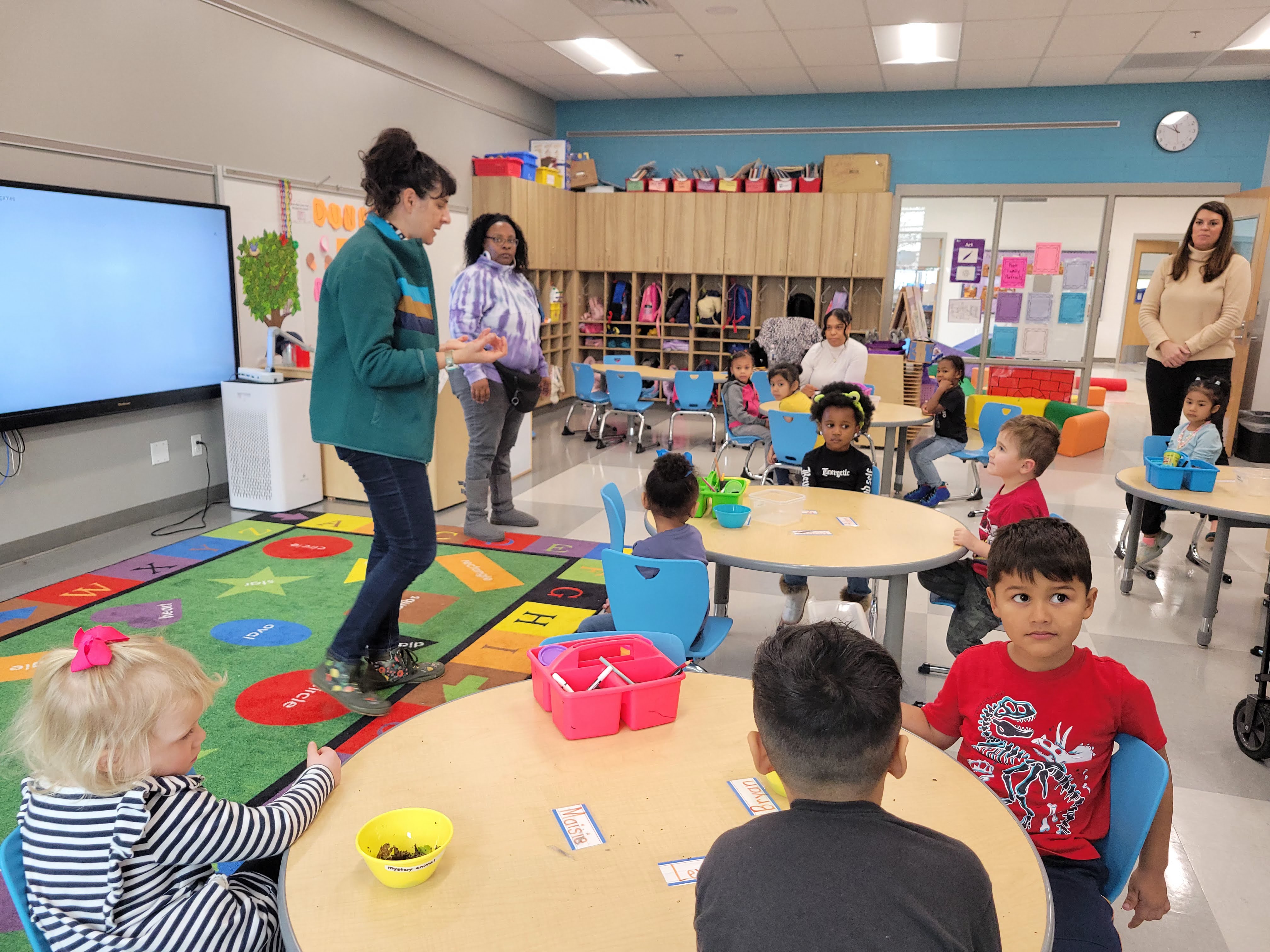 This is a picture of multiple Pre-Kindergarten classes listening to a story during a workshop led by ClearShark.