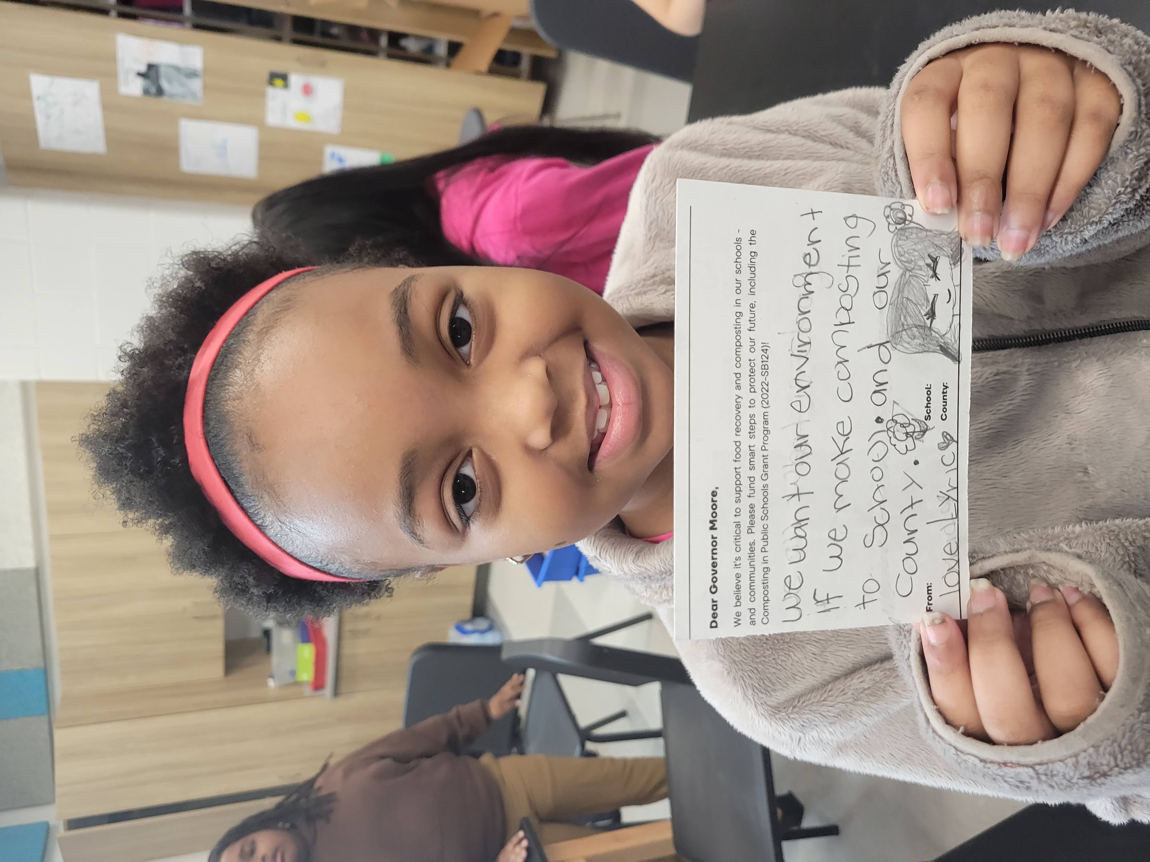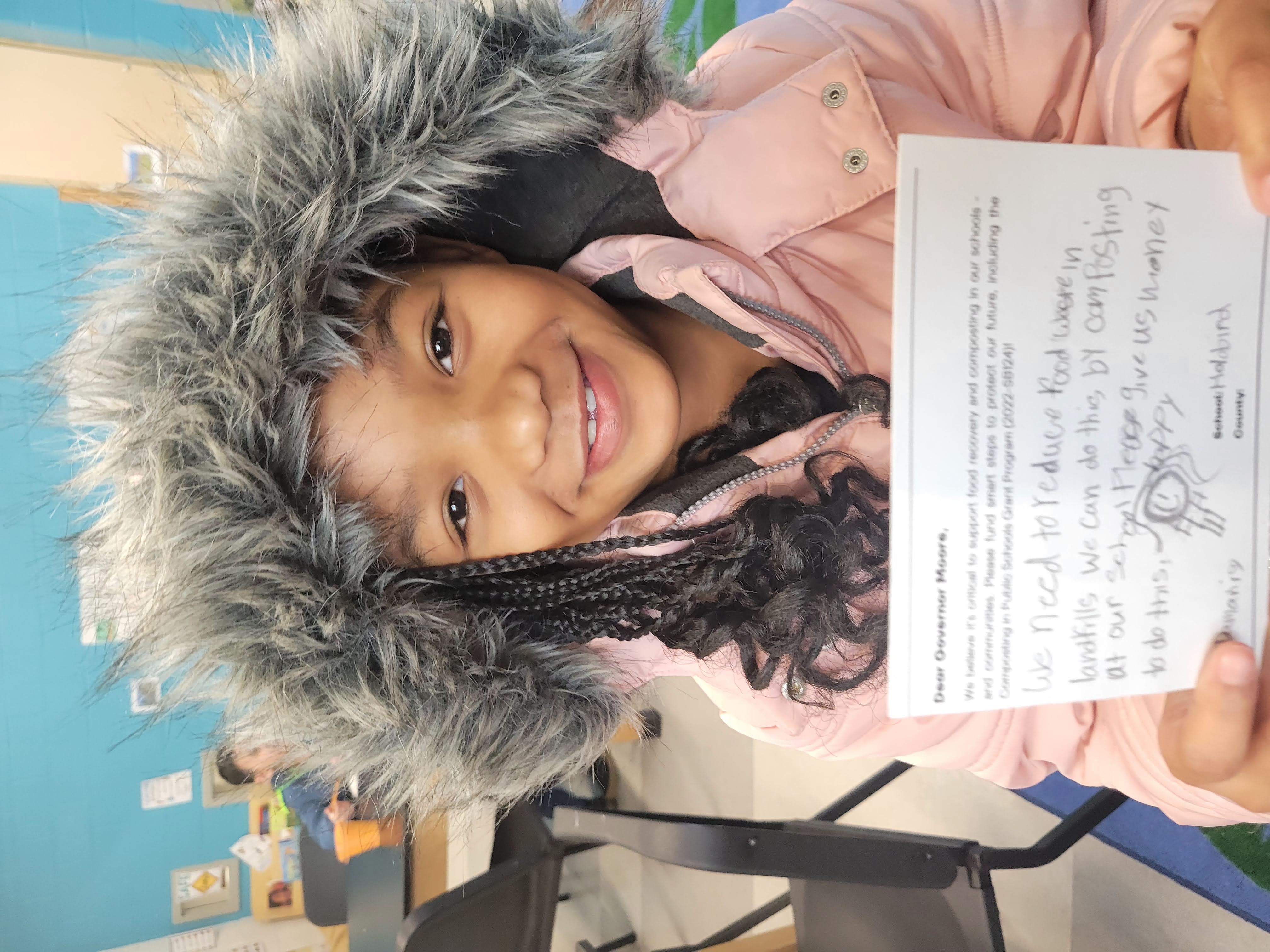 Maryland State Bill 124 advocates for there to be food waste reduction programs in schools. Students wrote letters to the governor to ask that he fund SB124. In their letters, students shared why composting is important and shared positive experiences of composting at Holabird.
