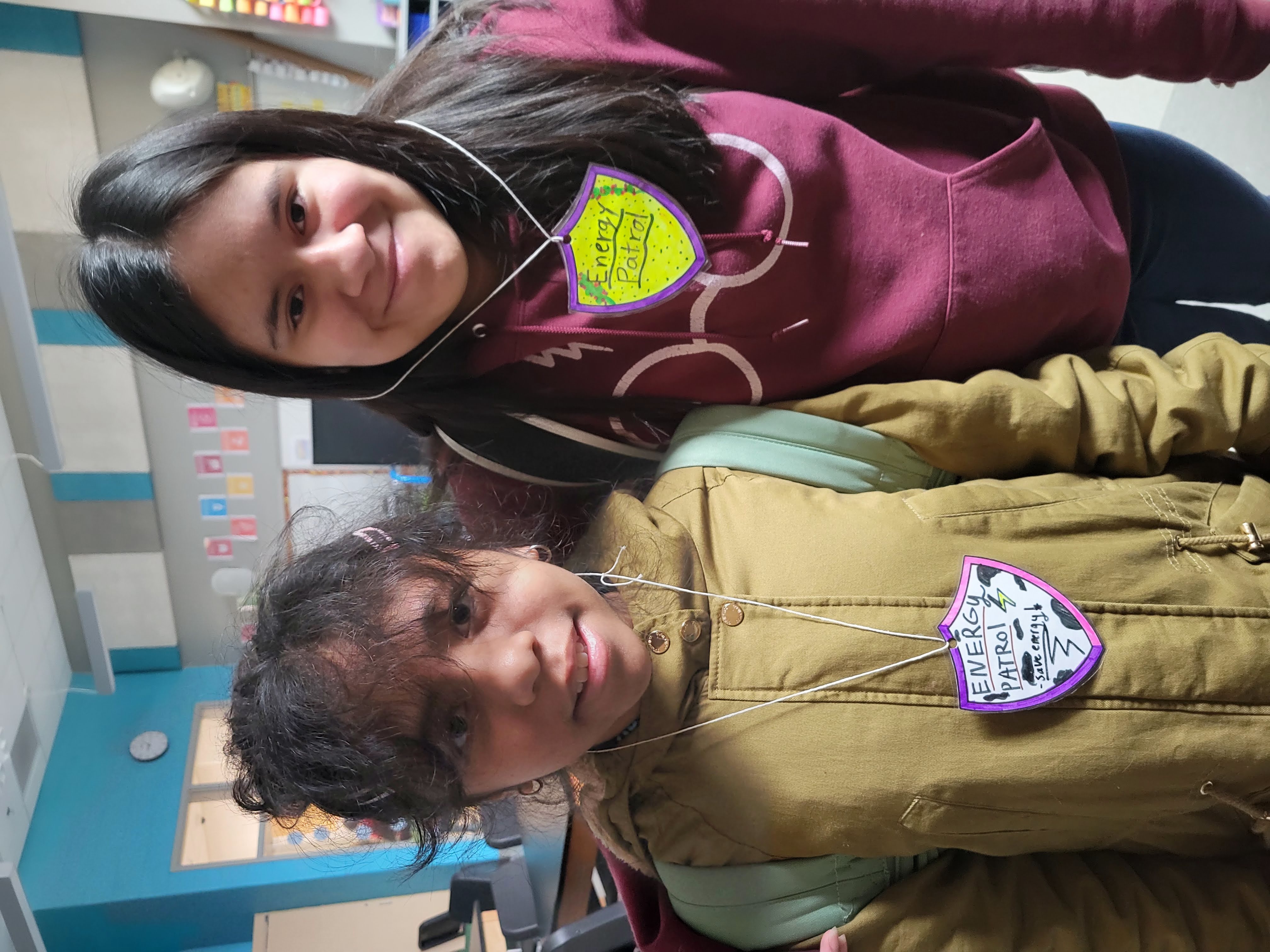 These are 2 students who were on the "Energy Patrol" for Lights Out Day. It was their responsibility to periodically walk around the building and respectfully remind people to turn off their lights whenever possible in an effort to conserve energy.