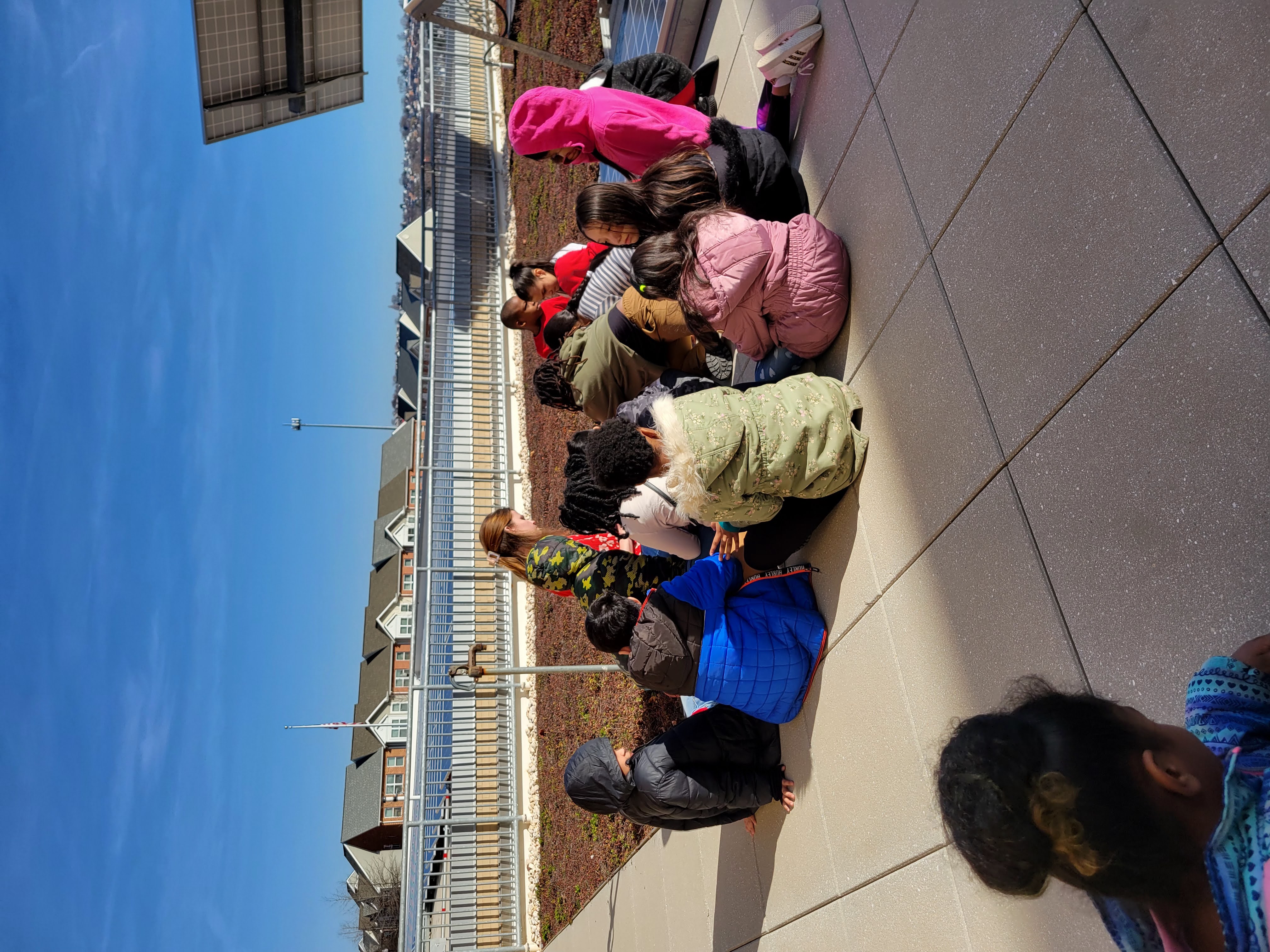 This is a picture of a 3rd grade class using the rooftop learning area to learn about solar panels and the green roof.