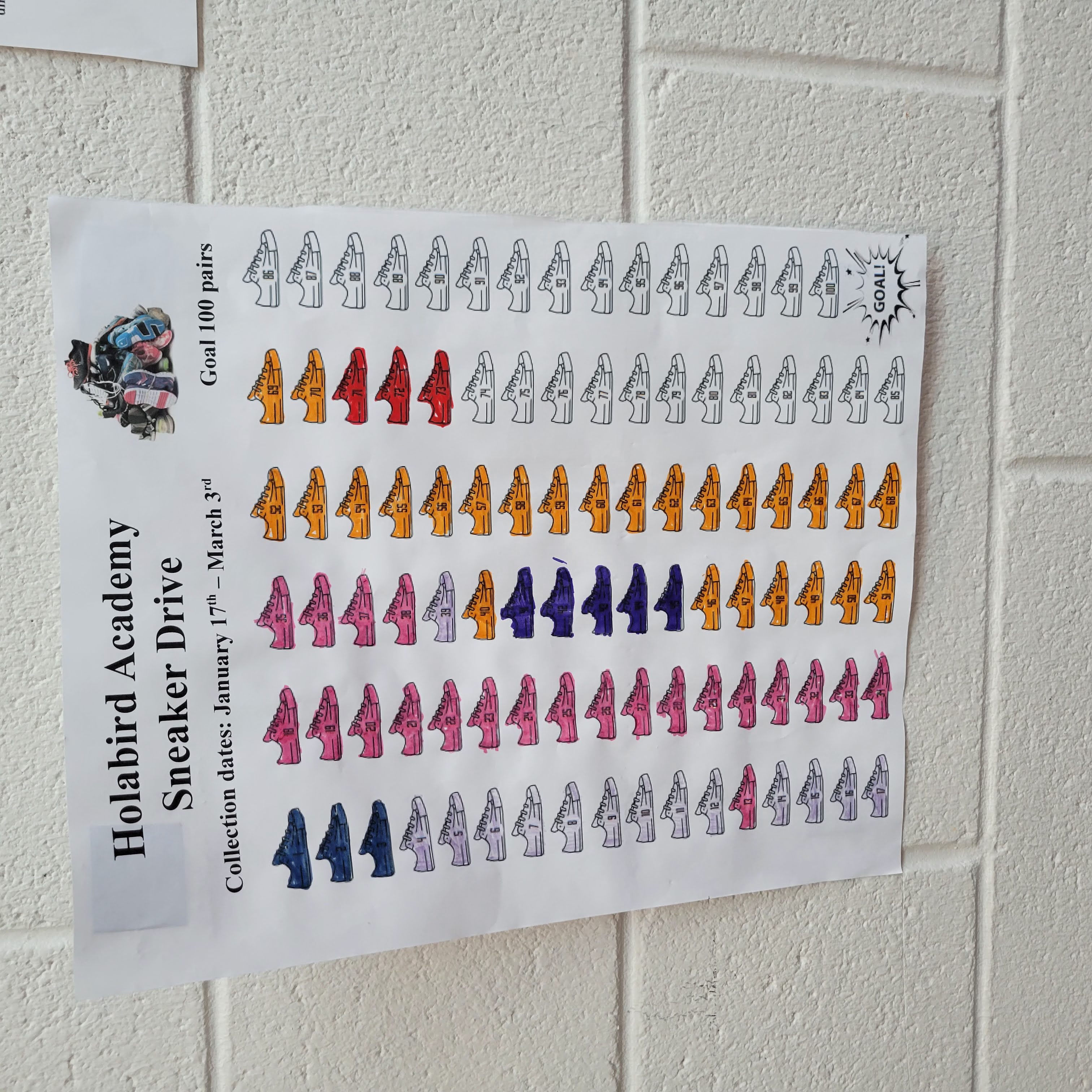 This is a poster that we displayed in the front lobby to track how many sneakers were collected throughout the Sneaker Drive.