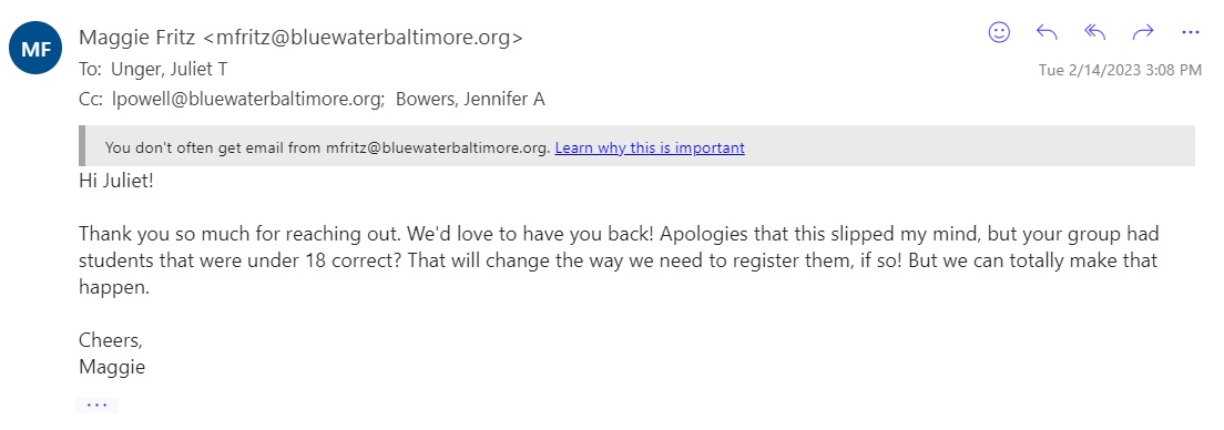 This email was sent by Blue Water Baltimore to continue the partnership with our Green Team and to confirm that we will attend the Earth Day clean up again in 2023.