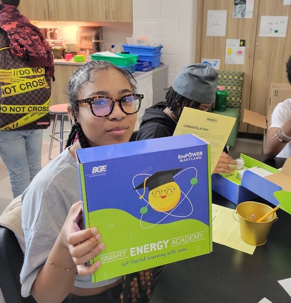 This is a picture of a student holding up their BGE Smart Energy kit before they brought it home .