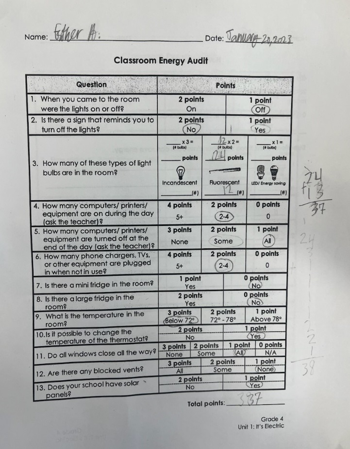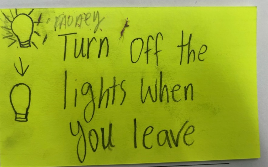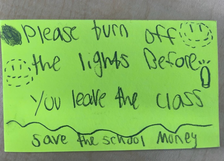 Each student completed an energy audit to track how much energy they used in their classroom. They used their audits to come up with solutions for how to reduce their daily energy use at school. Many students chose to make signs to post by light switches to inform others that turning off lights is an easy way to reduce their energy usage.
