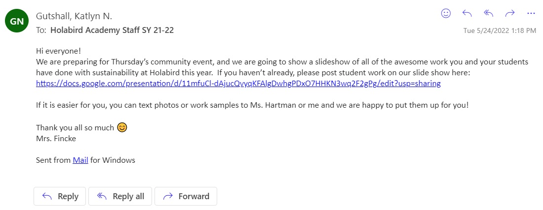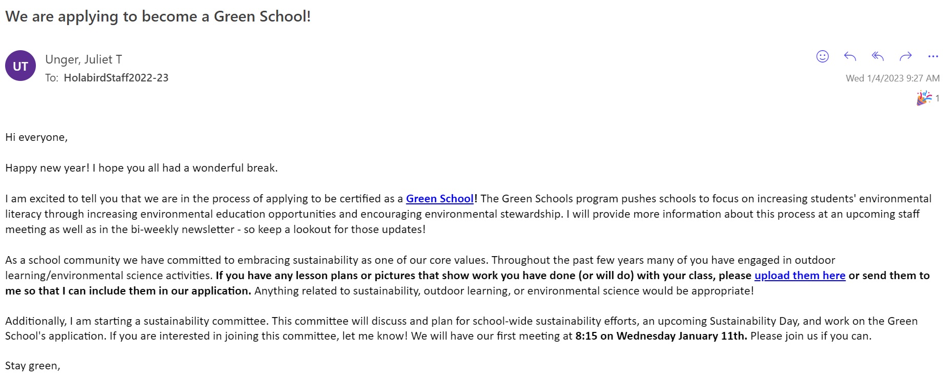 All staff are aware that Holabird Academy is applying to become a Green School. The Green School application process has been communicated to the entire staff via email, in person, and through the school's staff newsletter.