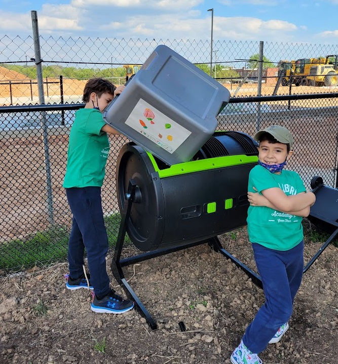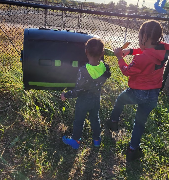 This is a picture of students putting compostable materials that they collected from classrooms into the tumbler.