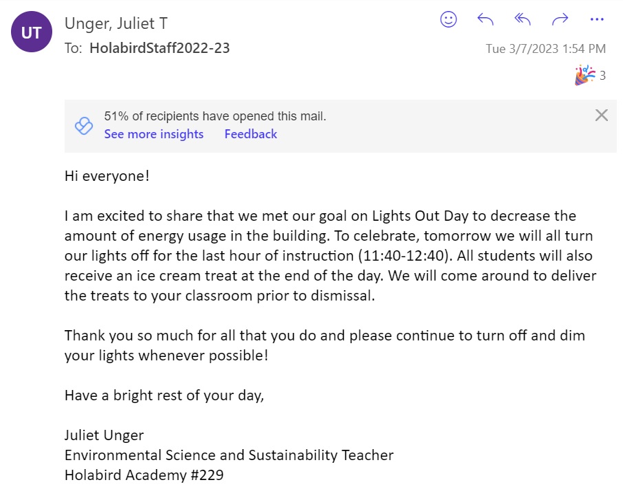 This email was sent to staff after the event to celebrate the goal of decreasing the building's energy usage on Lights Out Day. Since there was a noticeable decrease, the whole school celebrated by turning off their lights for an hour and having classroom popsicle parties.
