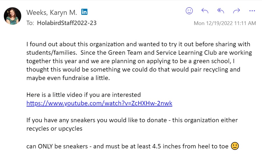 This email was sent to inform staff about the upcoming sneaker drive. After this email was sent, Ms. Weeks, the school guidance counselor, went into classrooms to tell teachers and students about the sneaker drive.