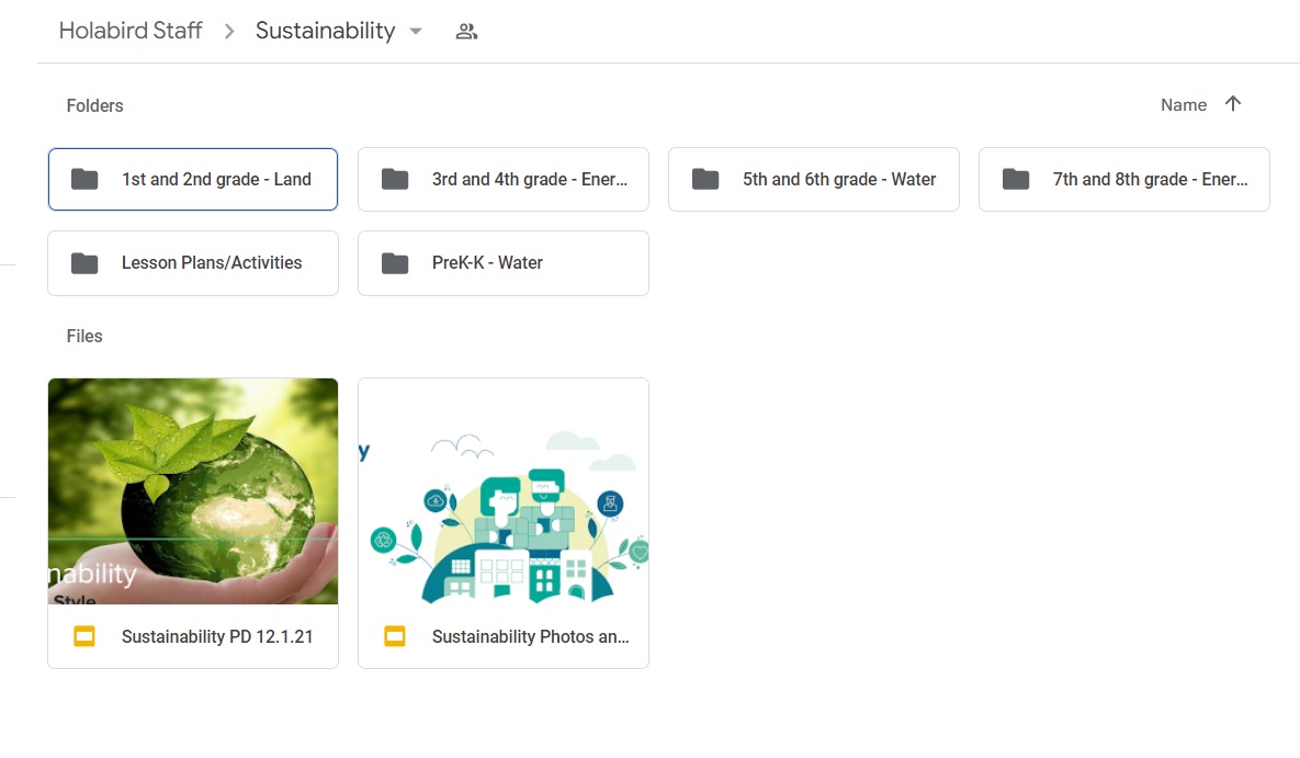In 2021, 4 Holabird Teachers collaborated to develop a sustainability curriculum for students in grades Pre-K-8. These lessons were developed to build upon one another and simultaneously deepen students understanding of sustainable topics as they engage in each curriculum throughout their time at Holabird. This is a picture of the sustainability curriculum Google Drive folder that is available to all staff members.