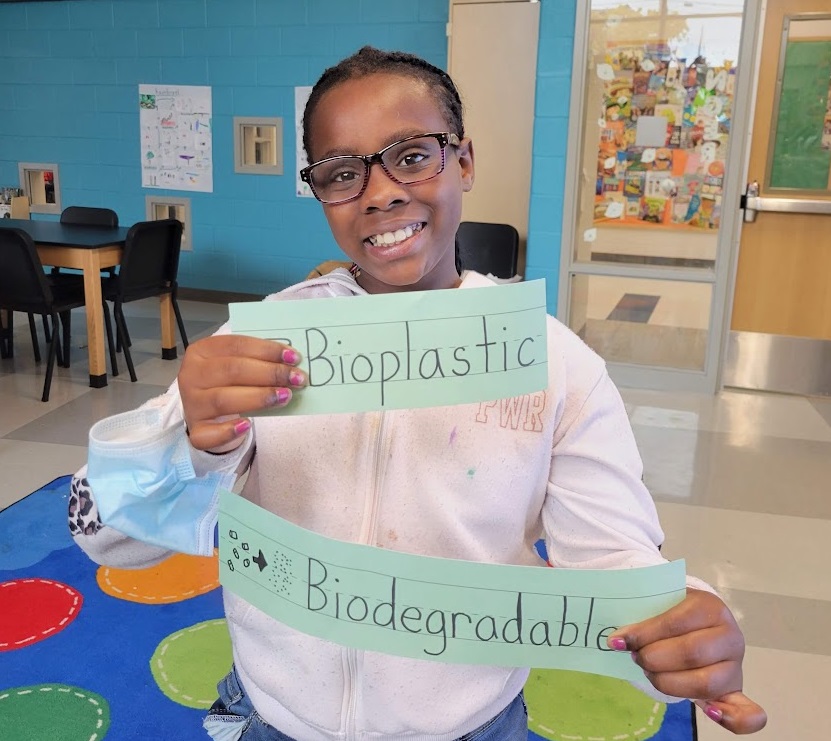 Students learned the terms "bioplastic" and "biodegradable" and then added them to our sustainability word wall.