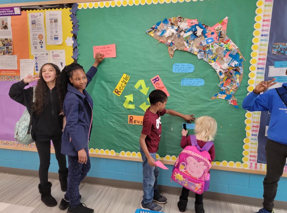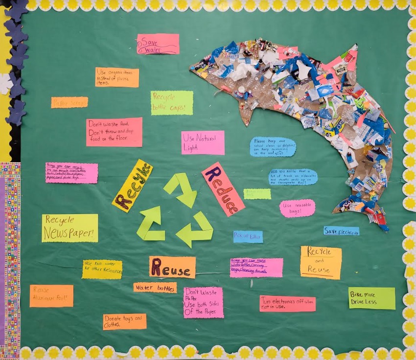 The Student Government Association started a Sustainability Committee. At the first meeting they discussed environmental concerns at school. Their top concern was the amount of trash that was accumulating in the school garden area and playgrounds. Students decided to collect trash to use to create a bulletin board in the school's main hallway that would inspire others to not litter and pick up trash.