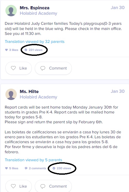This attachment shows the frequent use of Class Dojo by staff members to communicate with families. The number of views on each post reflect that families regularly check Class Dojo for updates.