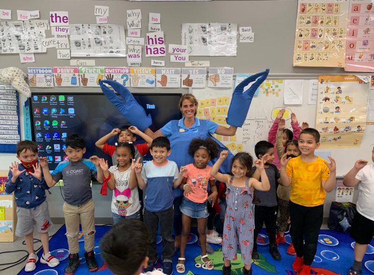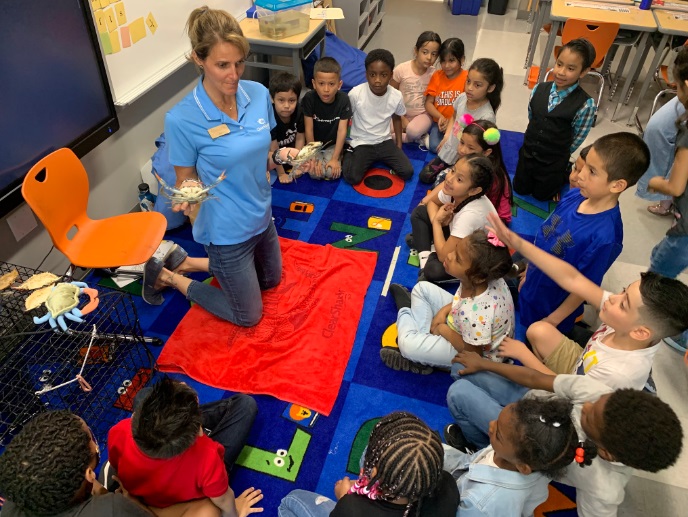 This is a picture of second graders engaging in a lesson about blue crabs.