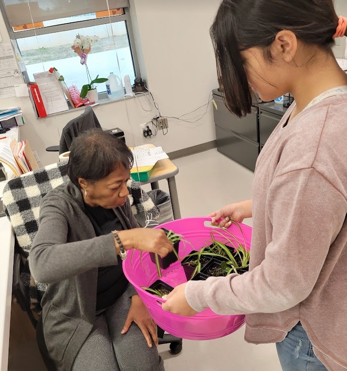 This is a picture of students separating Spider plants to put in individual pots that could then be distributed to teachers throughout the building.