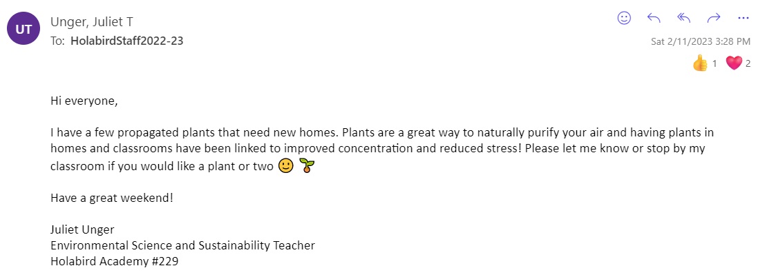 This email was sent to staff to let them know that there would be plants available for them to put in their classrooms. This email reinforces that having plants in classrooms can directly benefit the health of the school.