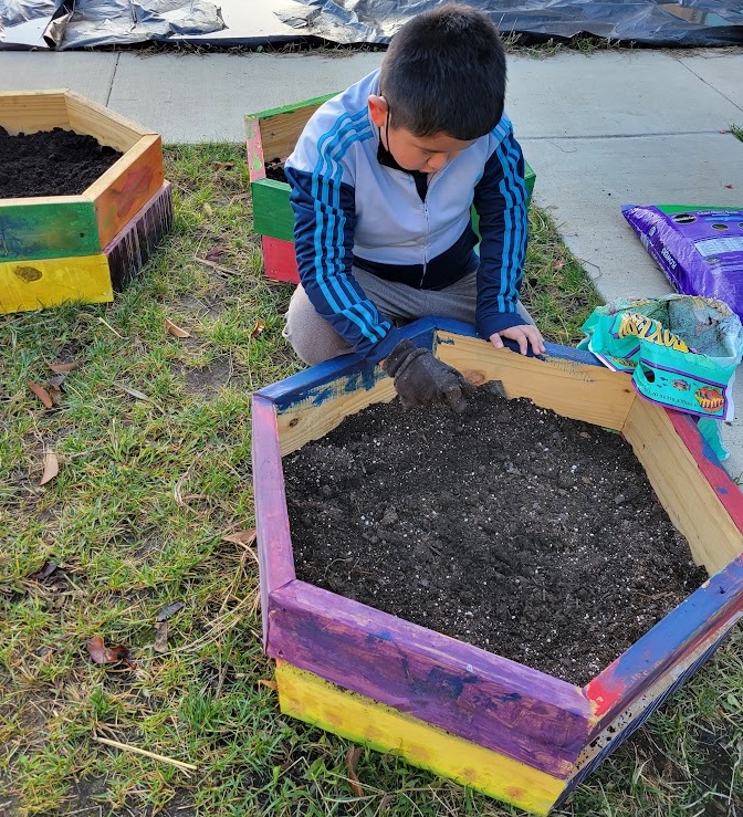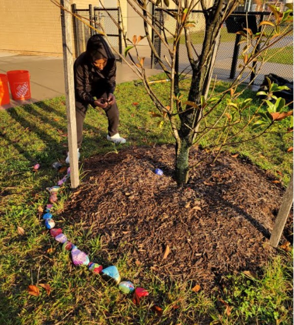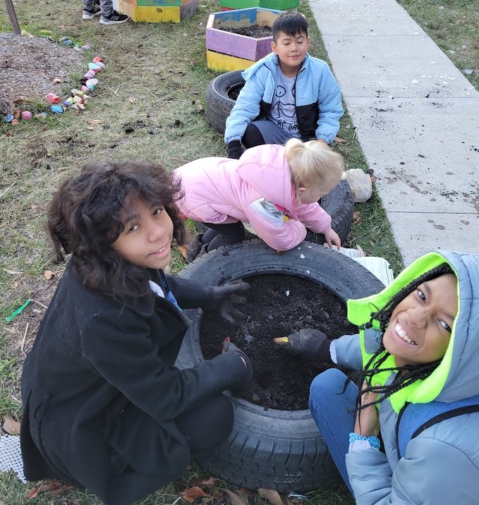 The school was provided with Hexagon Beds that were constructed by Baltimore City high school interns. Students used some of the hexagon beds to plant garlic and will use the remaining beds to plant herbs in the Spring. In 2021 a pile of tires was discovered close to Holabird. Students and staff members worked together to bring the tires to the school garden and repurpose them as flower beds.