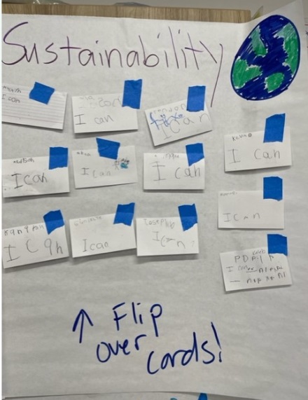 This picture is of a chart showing students' ideas about how to be more sustainable.