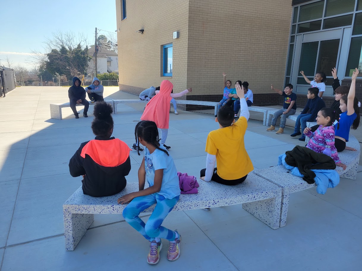 This picture is of students utilizing an outdoor seating area to engage in a student-facilitated game.