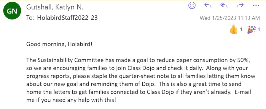 This is the paper that was sent home to all students with their report cards to communicate the effort to be more sustainable by dramatically reducing the amount of paper used by the school community. This paper also encourages families to utilize Class Dojo, a virtual communication platform, rather than using paper.