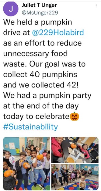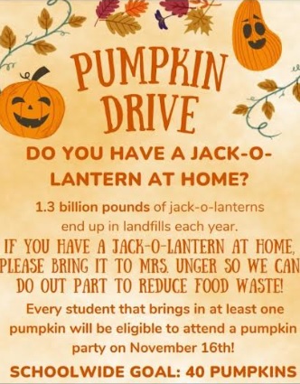 [school-wide celebration led by individual teachers in their classrooms.....] This year students identified that they noticed a large quantity of rotting pumpkins throughout their neighborhood. The Green Team decided to host a school-wide pumpkin drive to collect and compost rotting pumpkins and raise awareness about the harmful effects of food waste. We set a goal to collect 40 pumpkins and met that goal! We held a pumpkin party for each student who brought in a pumpkin to celebrate that we met our goal.