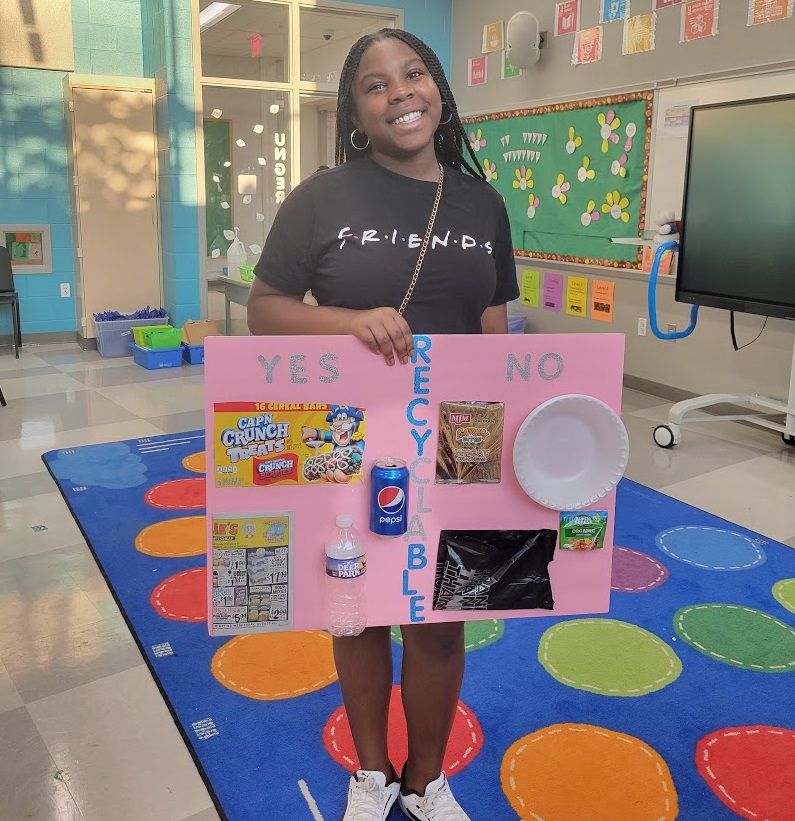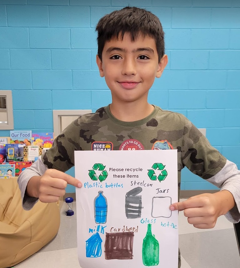 This picture shows an example of a sign that a student made to put next to recycling bins as a reminder of what items can be recycled.