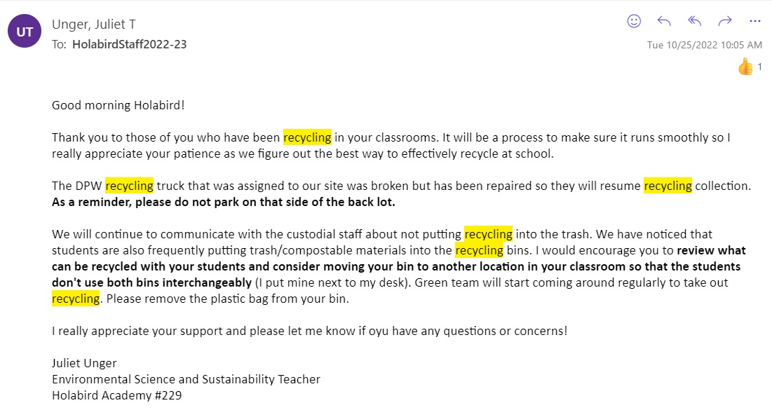 This is an email that was sent to the whole staff to remind them to use the bins properly and support school-wide recycling efforts.