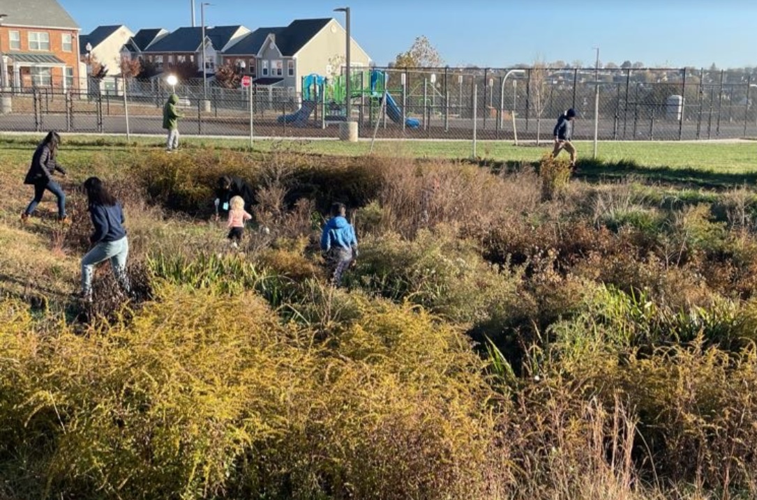 This is a picture of a student removing invasive plants from one of the native pollinator areas.