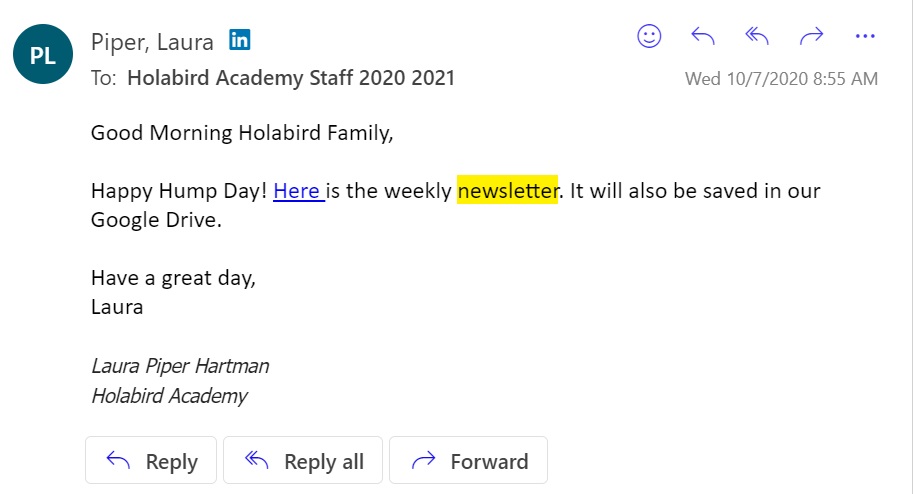 This email is evidence of the weekly newsletter s being shared virtually instead of physically.