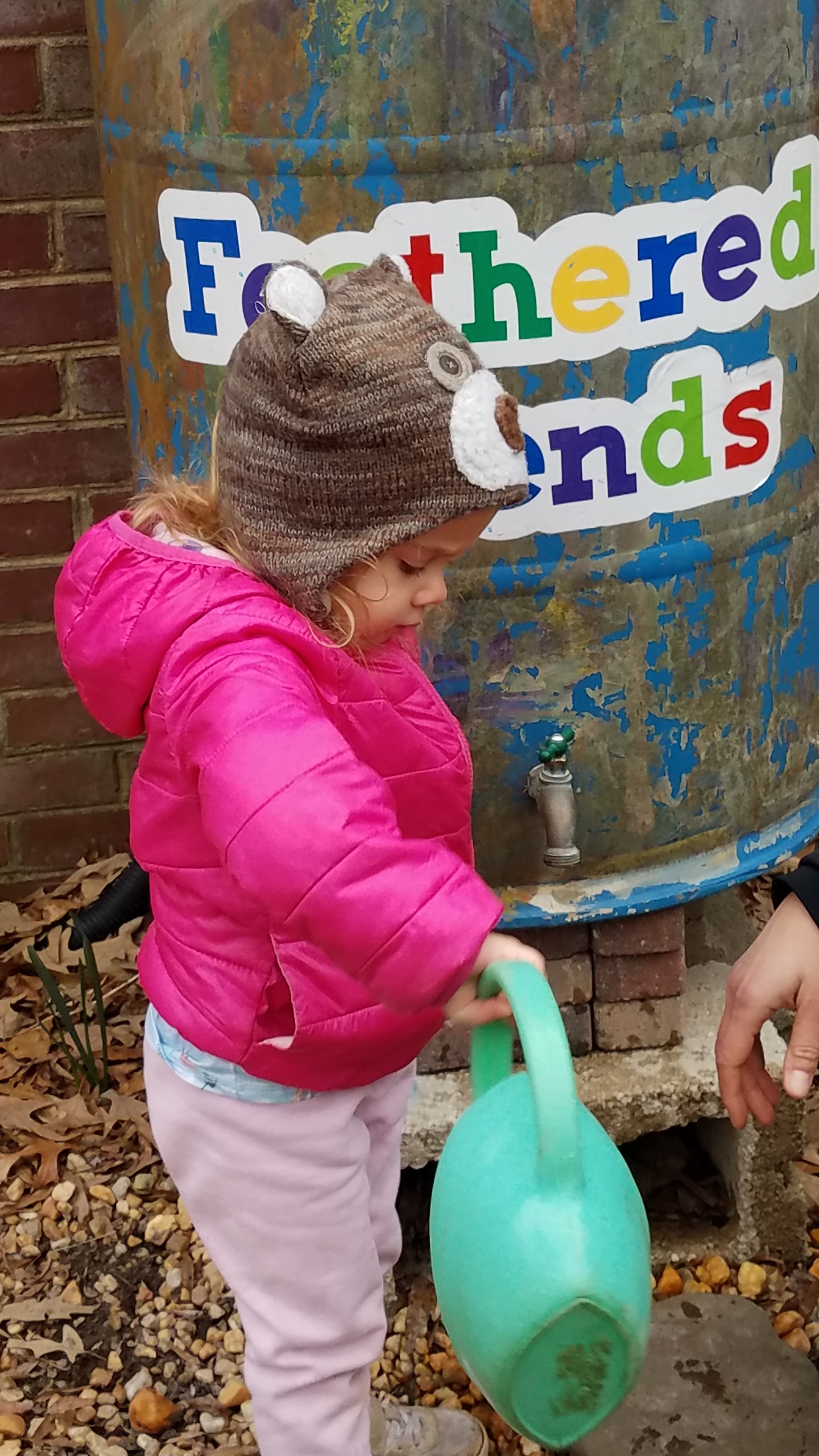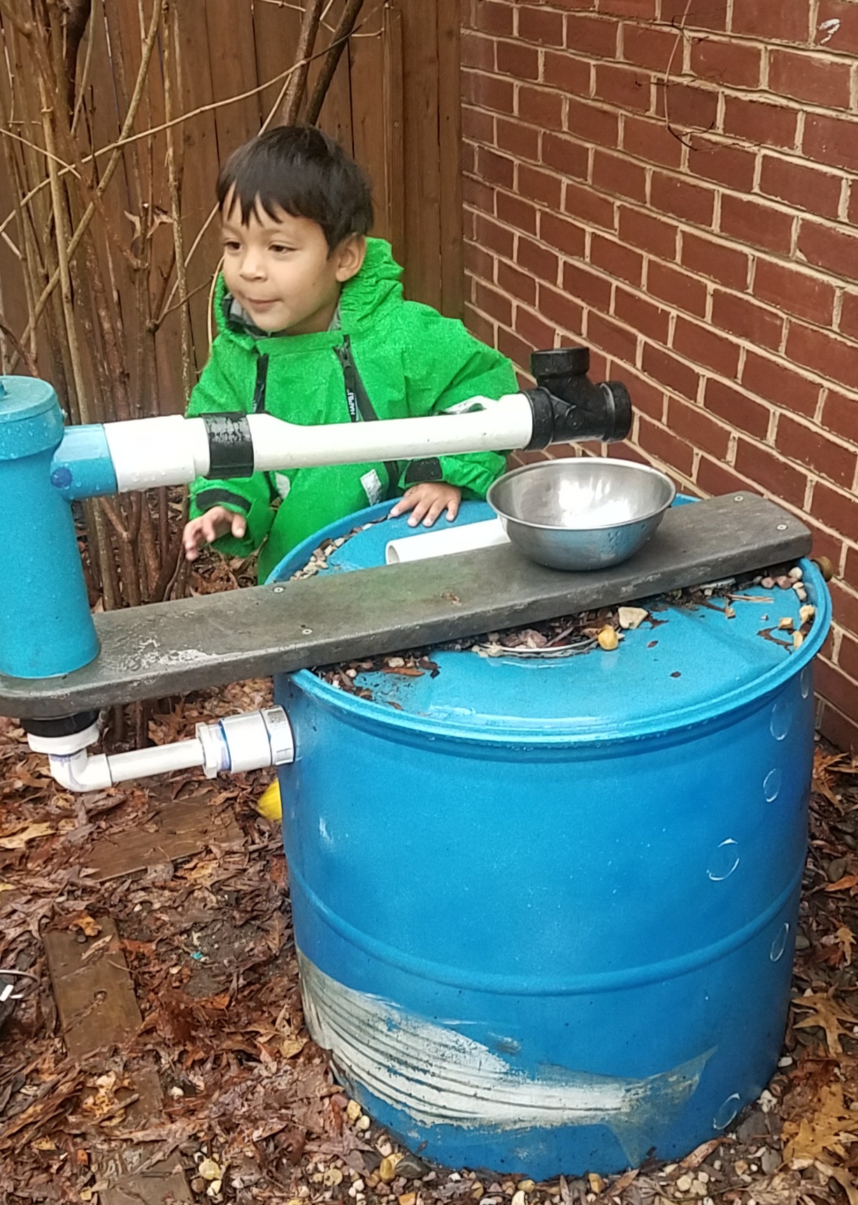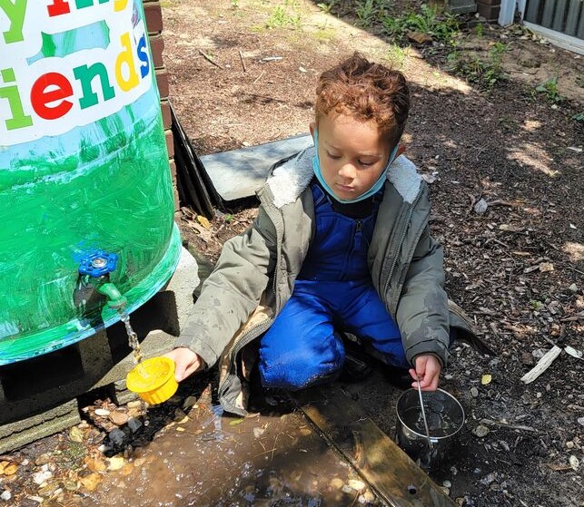 Students in all age groups use water from the rain barrels to water the plants, and in the mud kitchen, reducing water use.