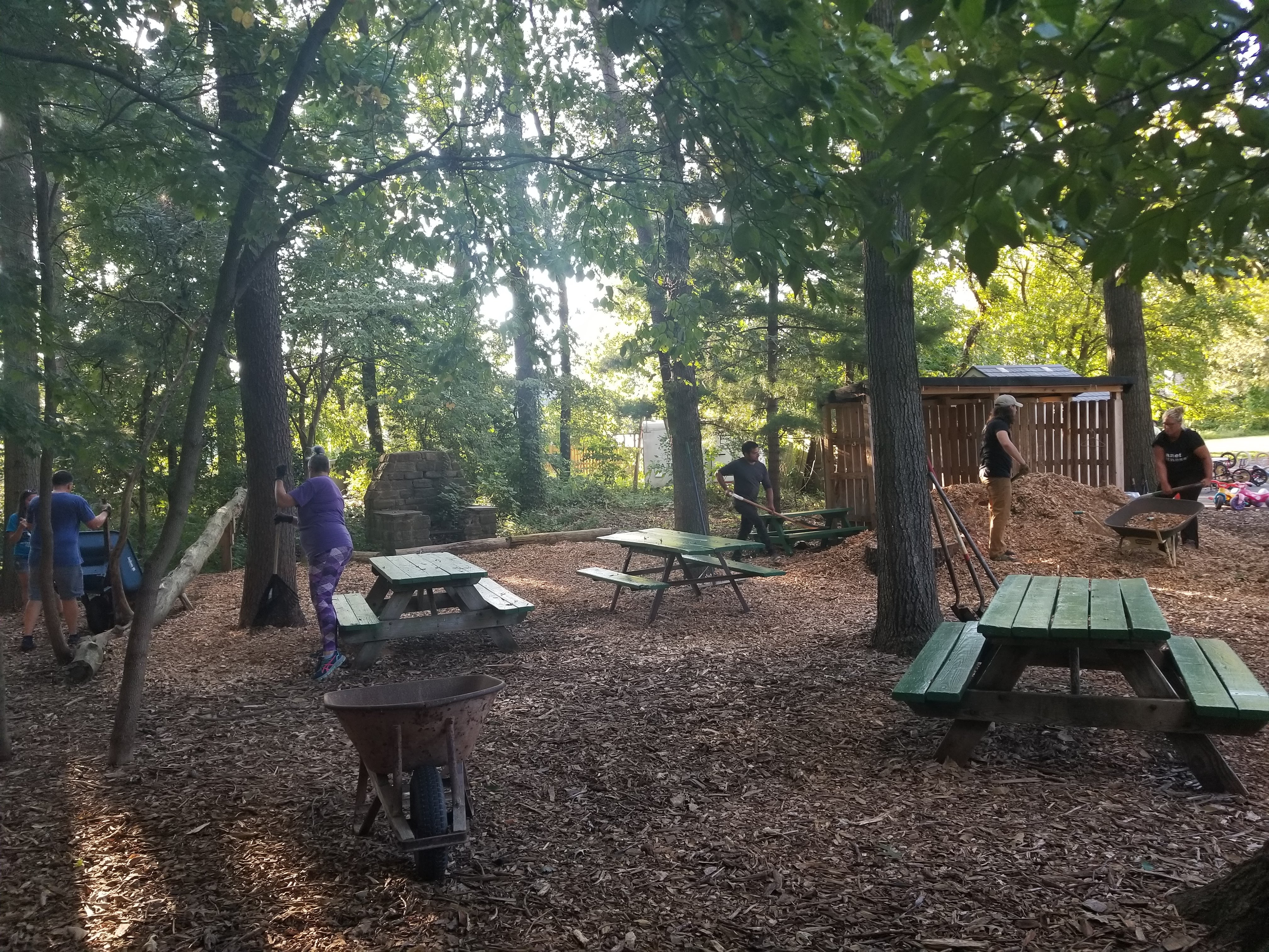 Families help to mulch the trails.