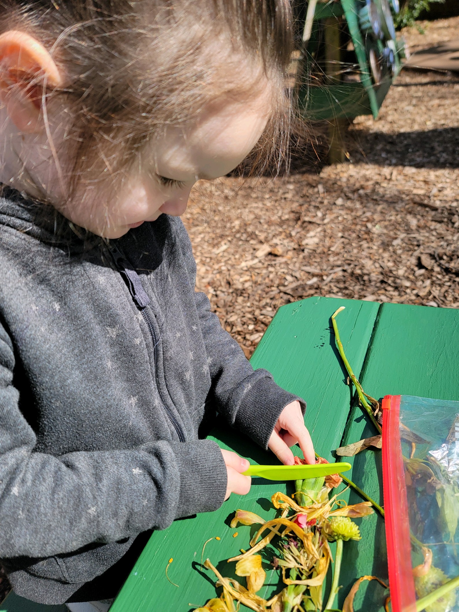 Our 3/4 and both of our 4 year old Pre-K classes learned about the parts and functions of a flower. This culminated in having the students dissect donated plants and flowers. Students used tweezers, scissors, knives, chopsticks, magnifying glasses and their fingers as tools to aid in the dissection process. Parts of the plant were examines, identified and compared and contrasted. This activity also gave students a close up look at at pollen production, connecting to our pollinator plants.