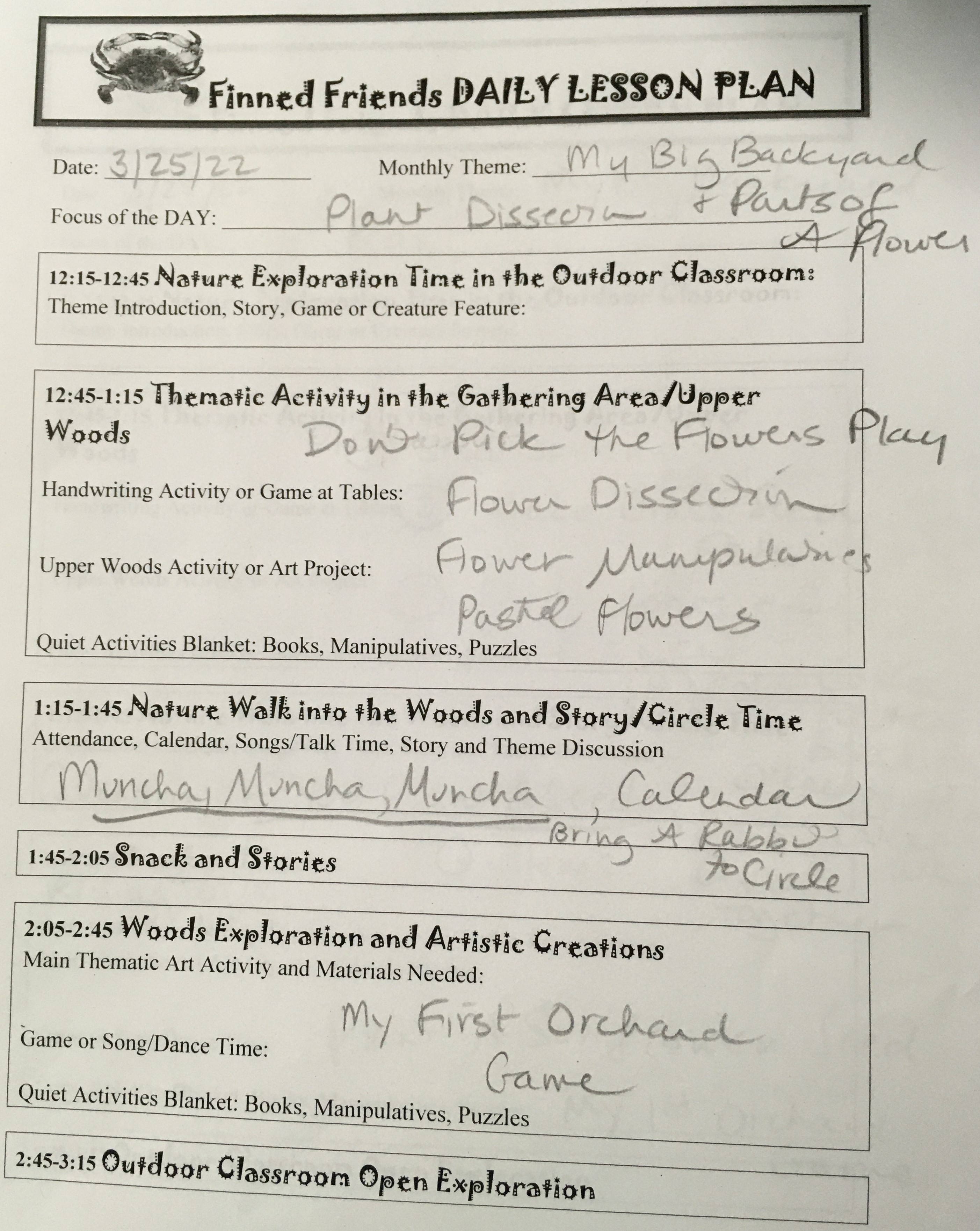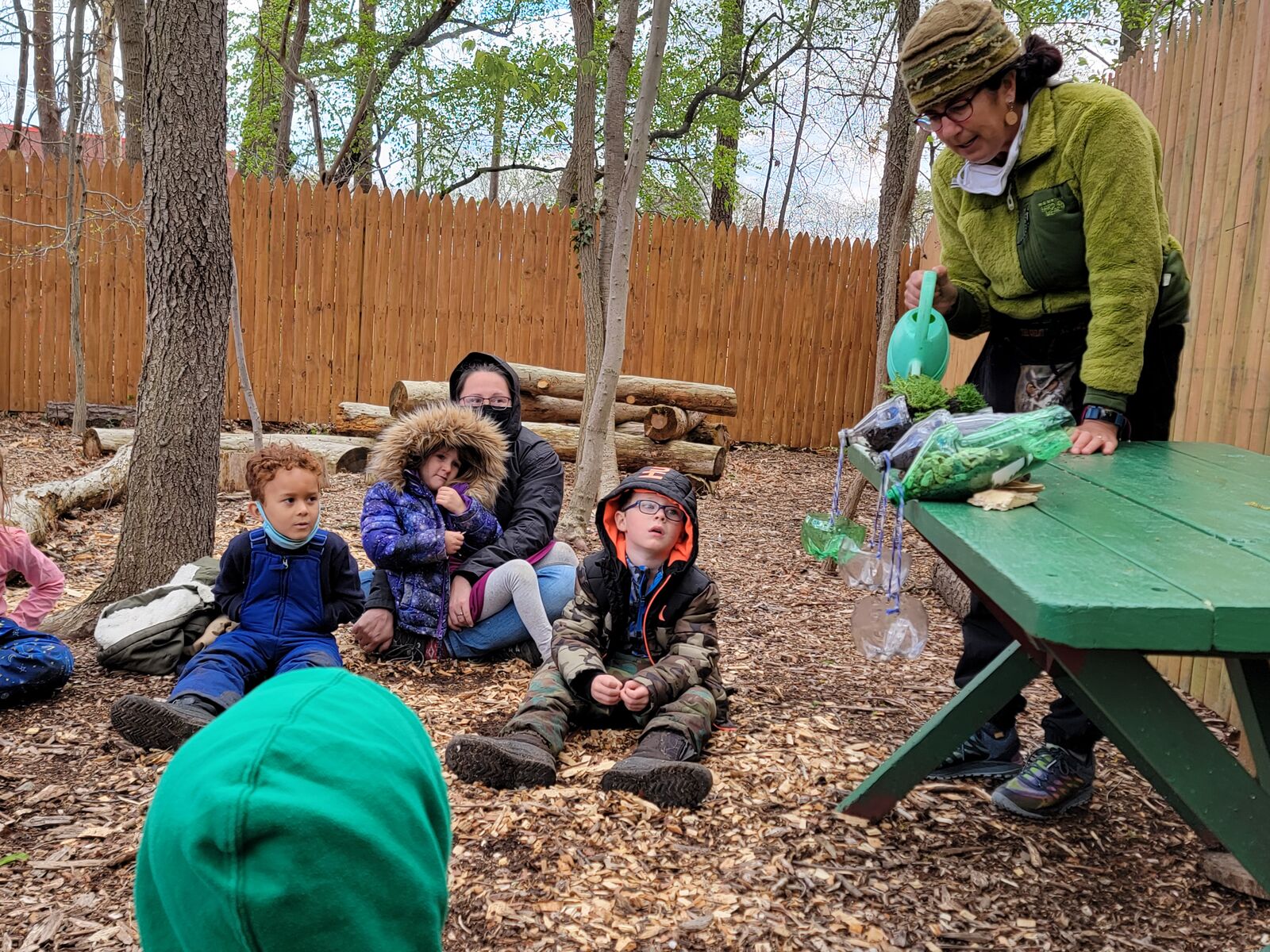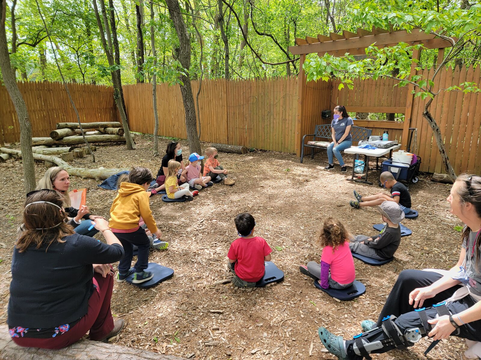 We utilize blankets and seat cushions, or simply sit on the ground to do our circle time outside on most days.