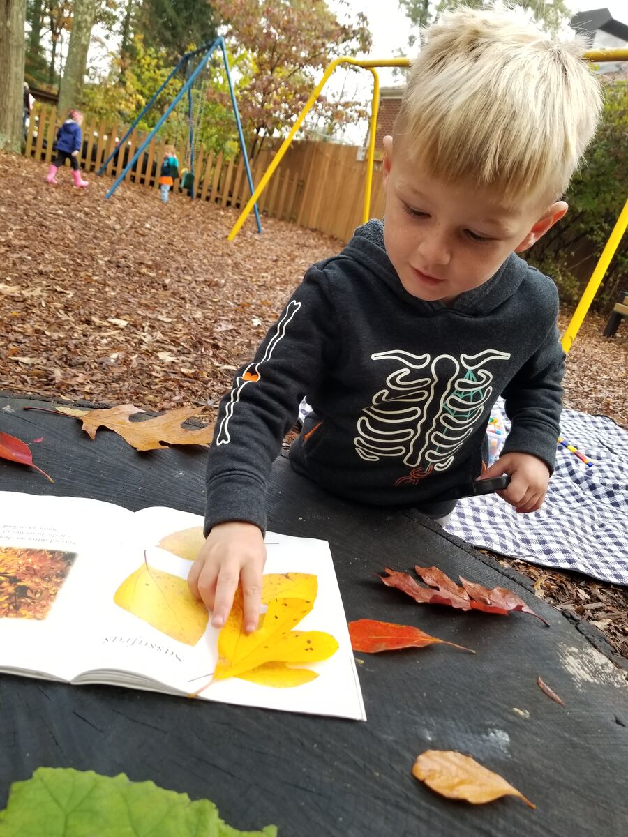 Our 3 year old class explored the changing leaves. They identified different leaves found on our campus, sorted them by different traits, and noticed the sound of the leaves under their feet while walking and what happened to the leaves on the trails.