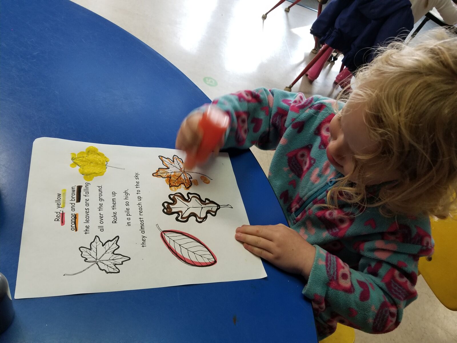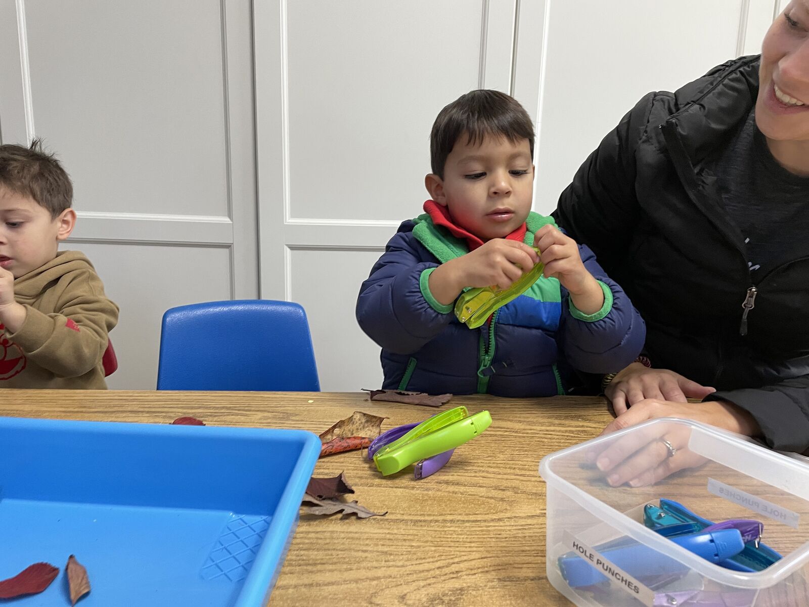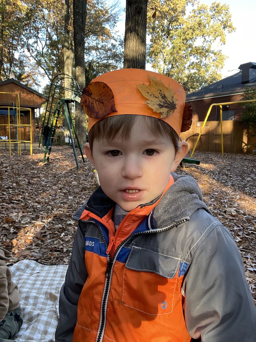 Our 2/3 year old class learned about leaves and autumn. They practiced color and shape sorting with leaves, used hole punches with collected leaves, and made leaf crowns.