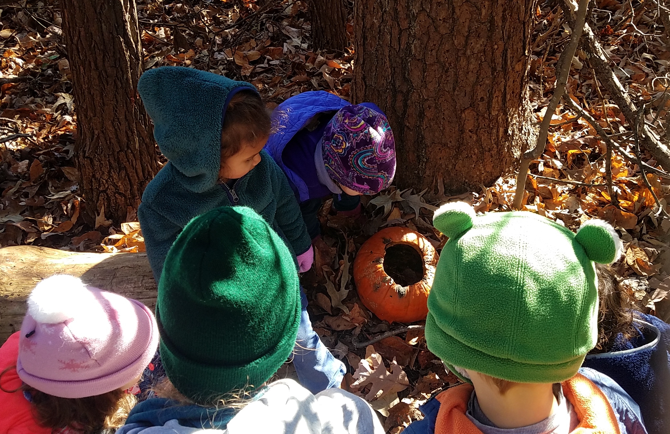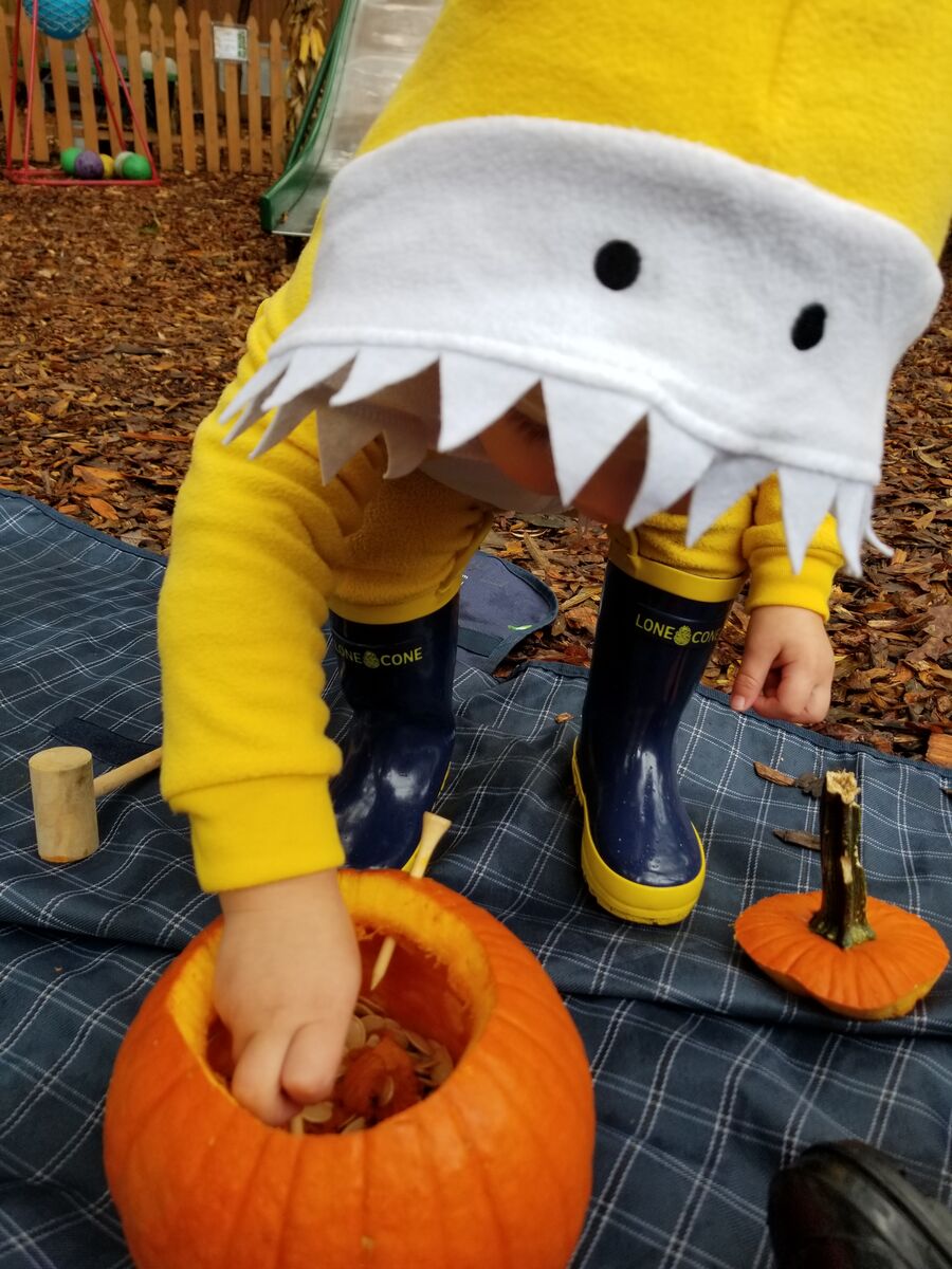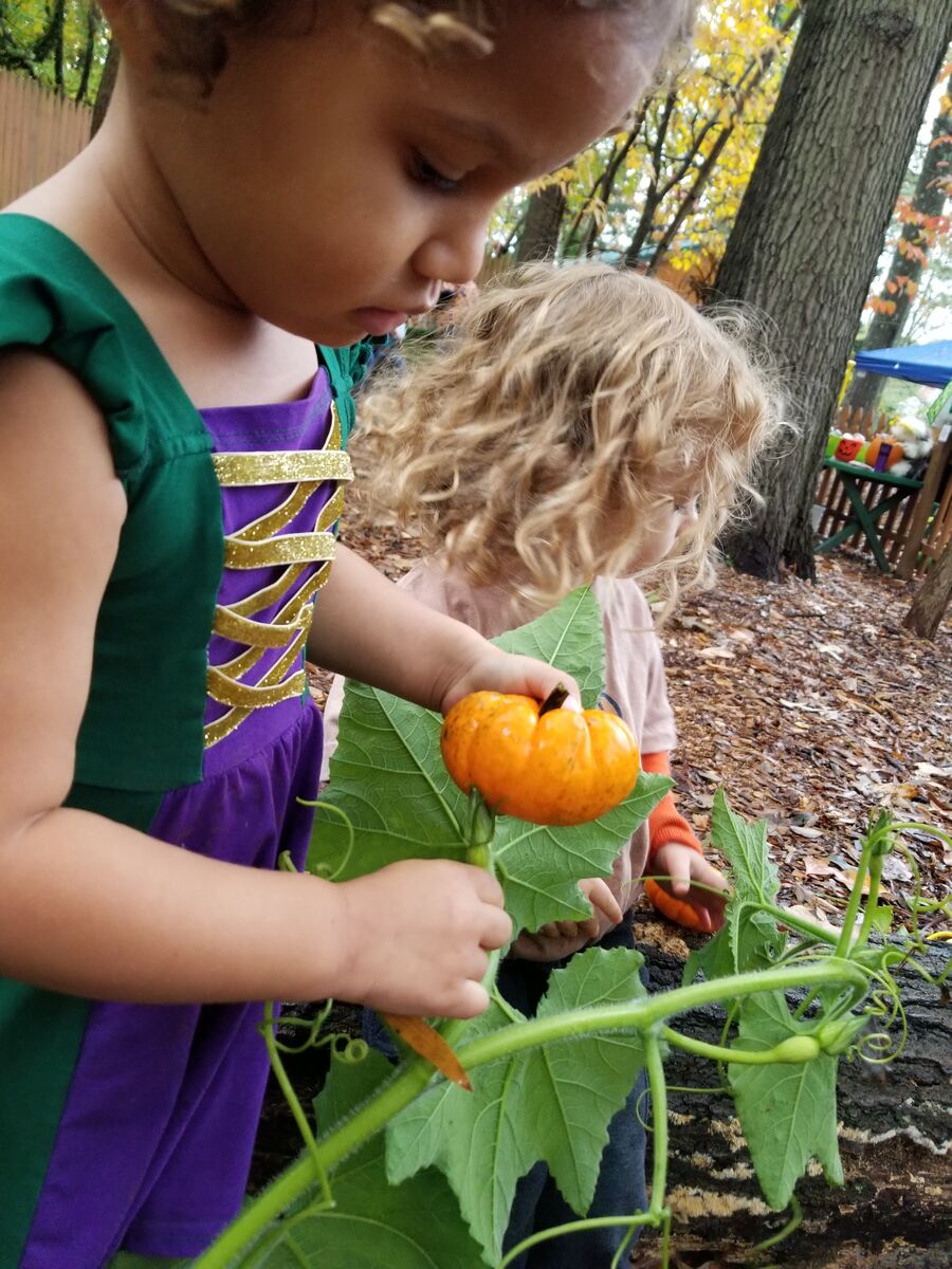 Our 2 year old class learned about the life cycle of a pumpkin. They explored a pumpkin vine, played with pumpkins, and reached inside to find the seeds. The vine was brought in by one of our families and had multiple blooms in different stages between flower and young pumpkin to show the progression. After investigating the inside of the pumpkin the students left the pumpkin out on our trails for some of our forest friends to enjoy. Over the next few weeks the class returned to the pumpkin to notice changes as the pumpkin decomposed.