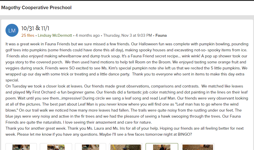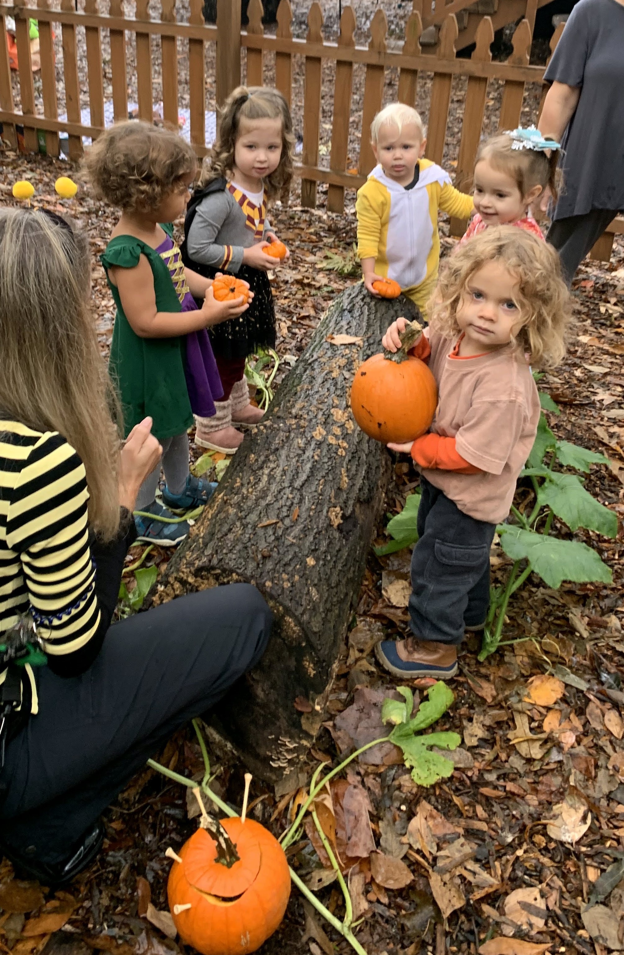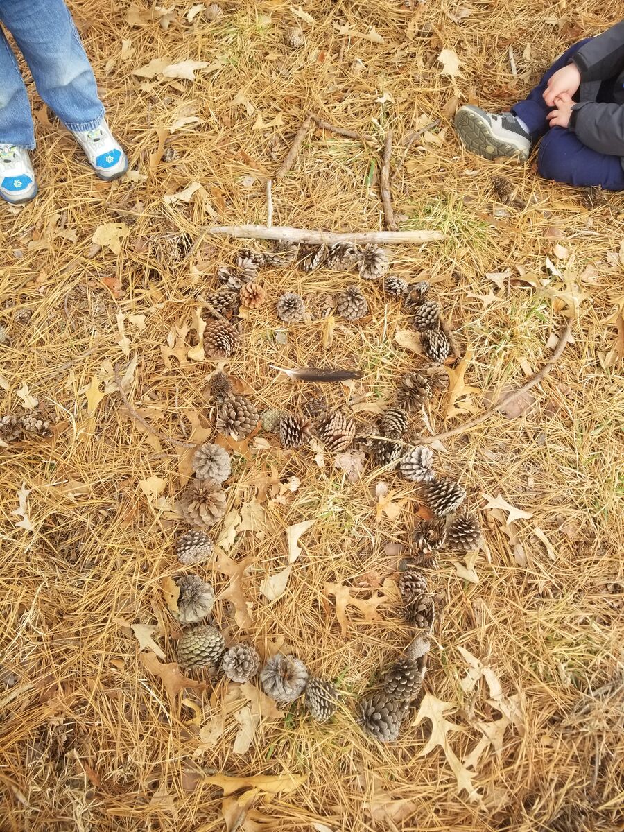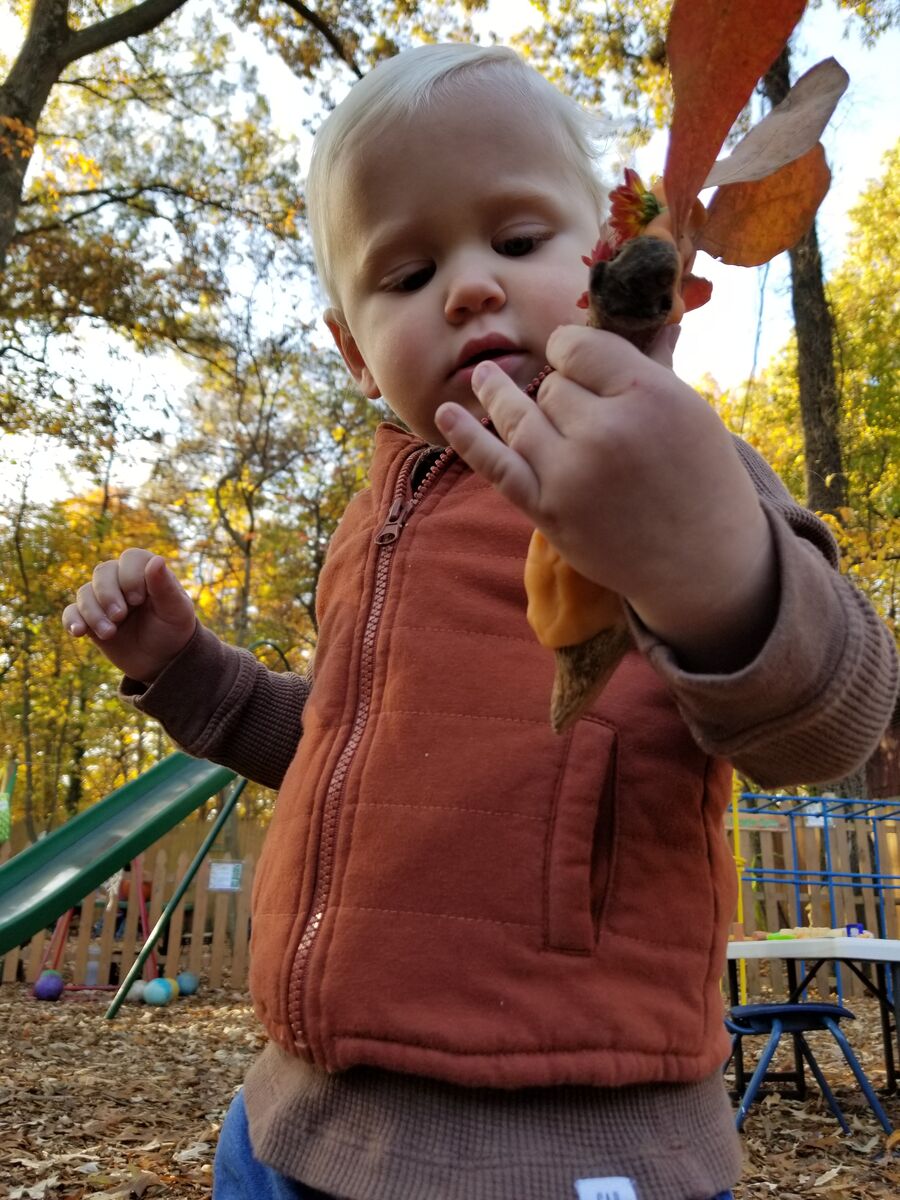 Our 2 year old class learned about the life cycle of a pumpkin. They explored a pumpkin vine, played with pumpkins, and reached inside to find the seeds. The vine was brought in by one of our families and had multiple blooms in different stages between flower and young pumpkin to show the progression. After investigating the inside of the pumpkin the students left the pumpkin out on our trails for some of our forest friends to enjoy. Over the next few weeks the class returned to the pumpkin to notice changes as the pumpkin decomposed.