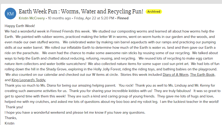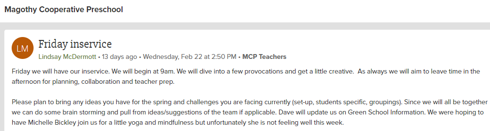 Green School updates have been presented at our board meetings and during staff inservice. Staff were asked to select one or two of their favorite days/lesson for inclusion in the application.