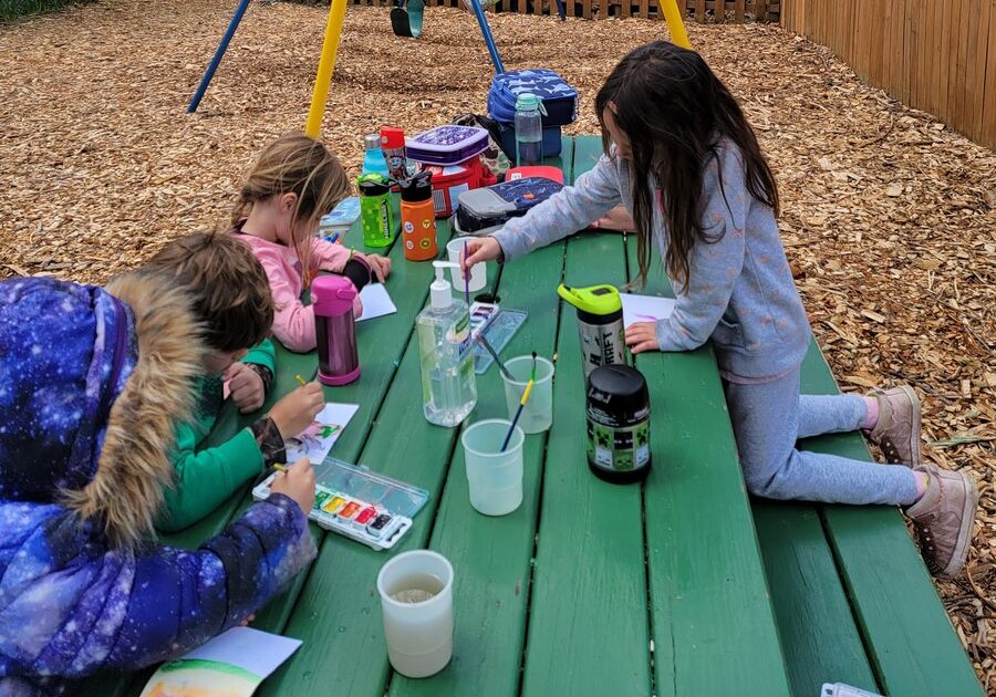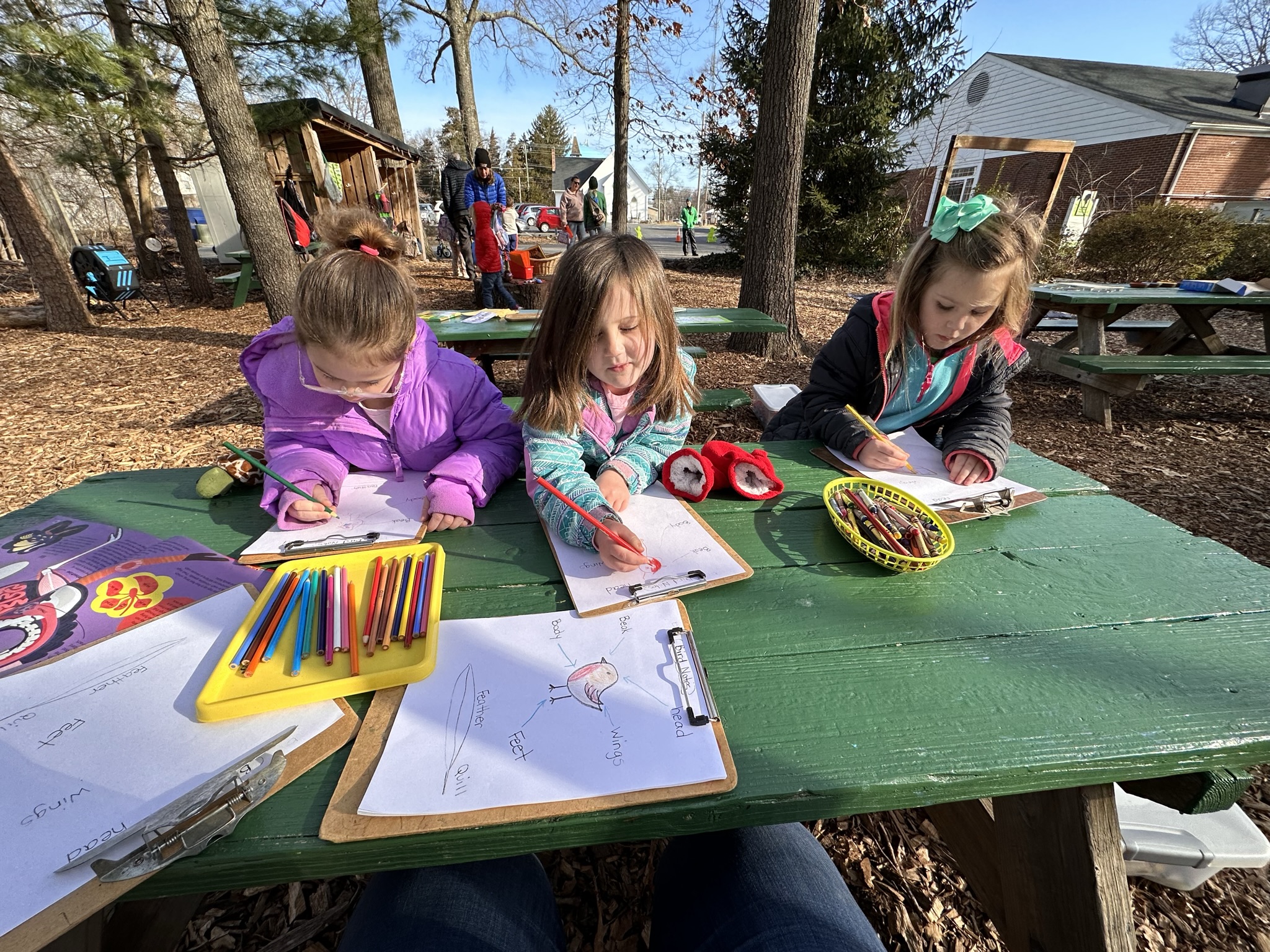 Drawing and coloring on the picnic tables.