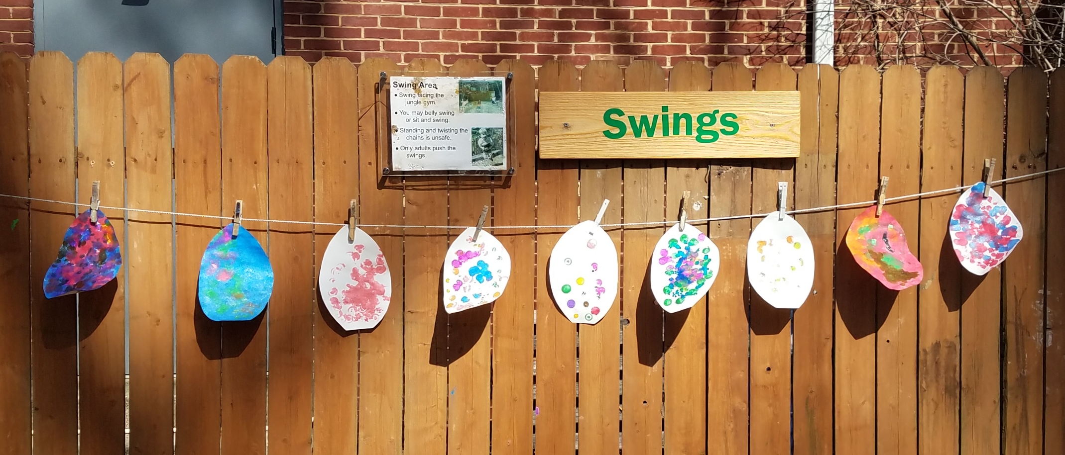 Drying paintings on the playground fence.