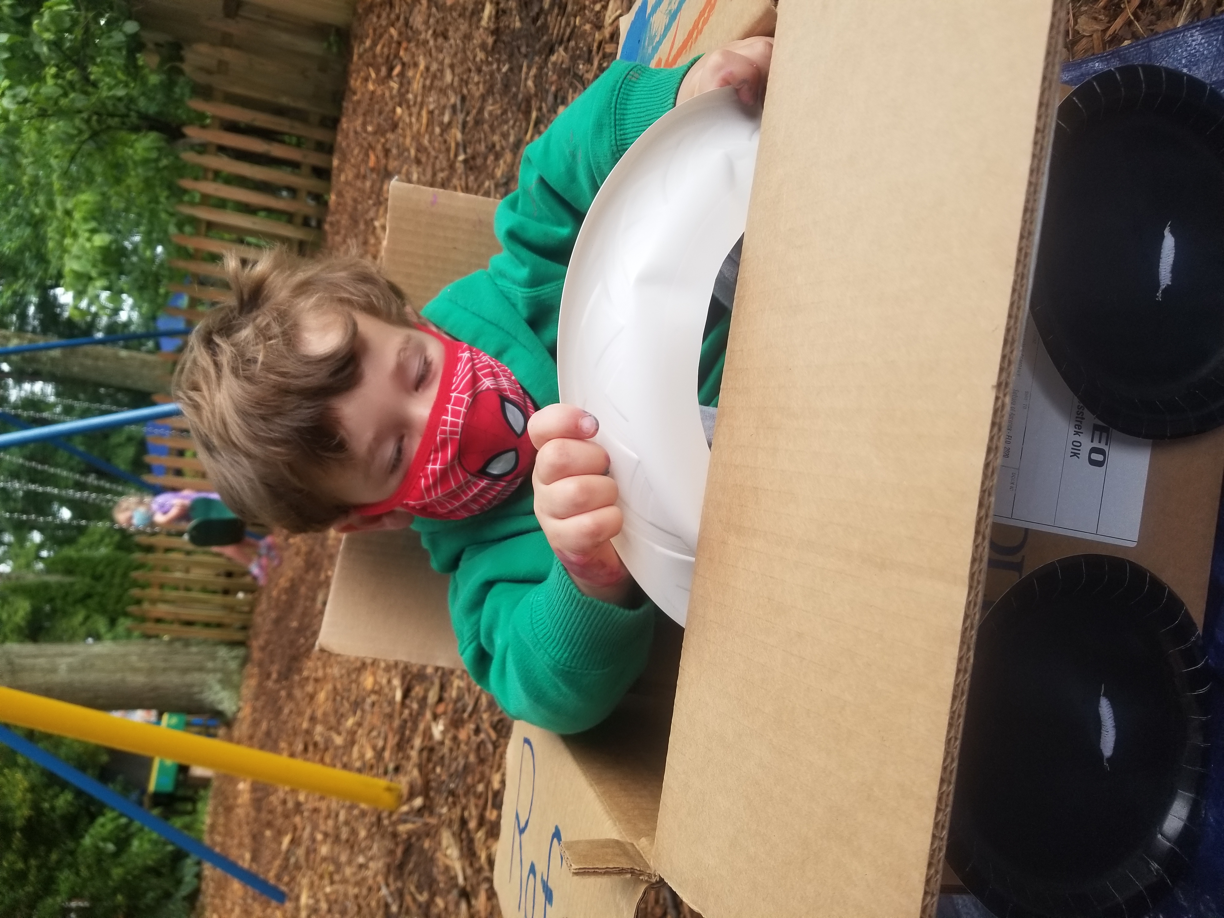Manning the pirate ship made from recycled boxes, tubes, and old tablecloth sails.