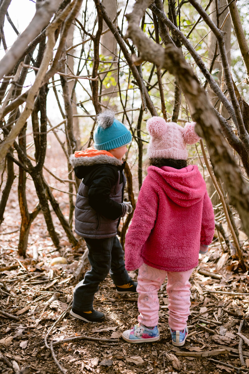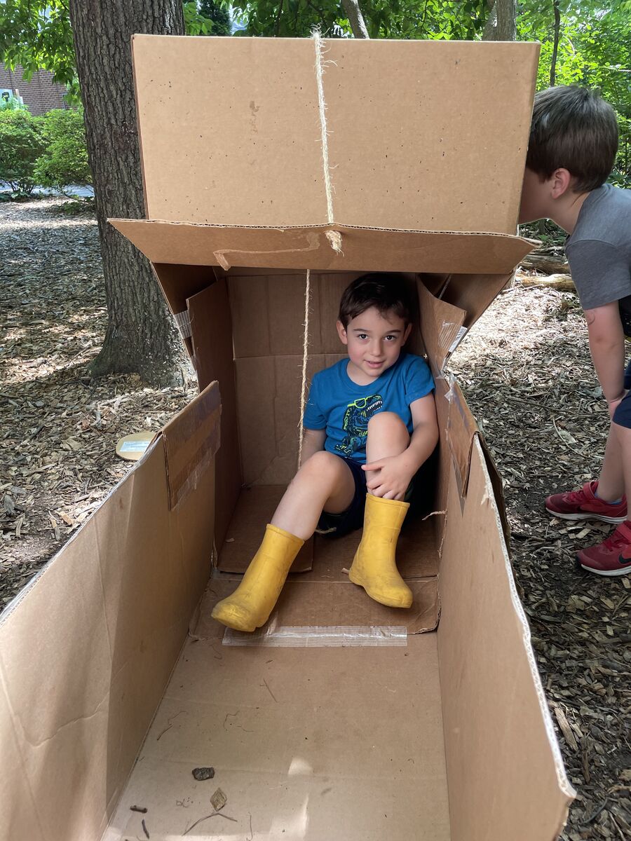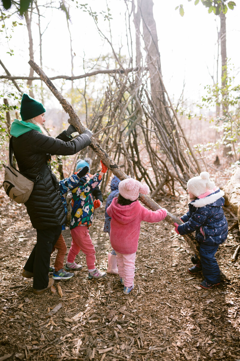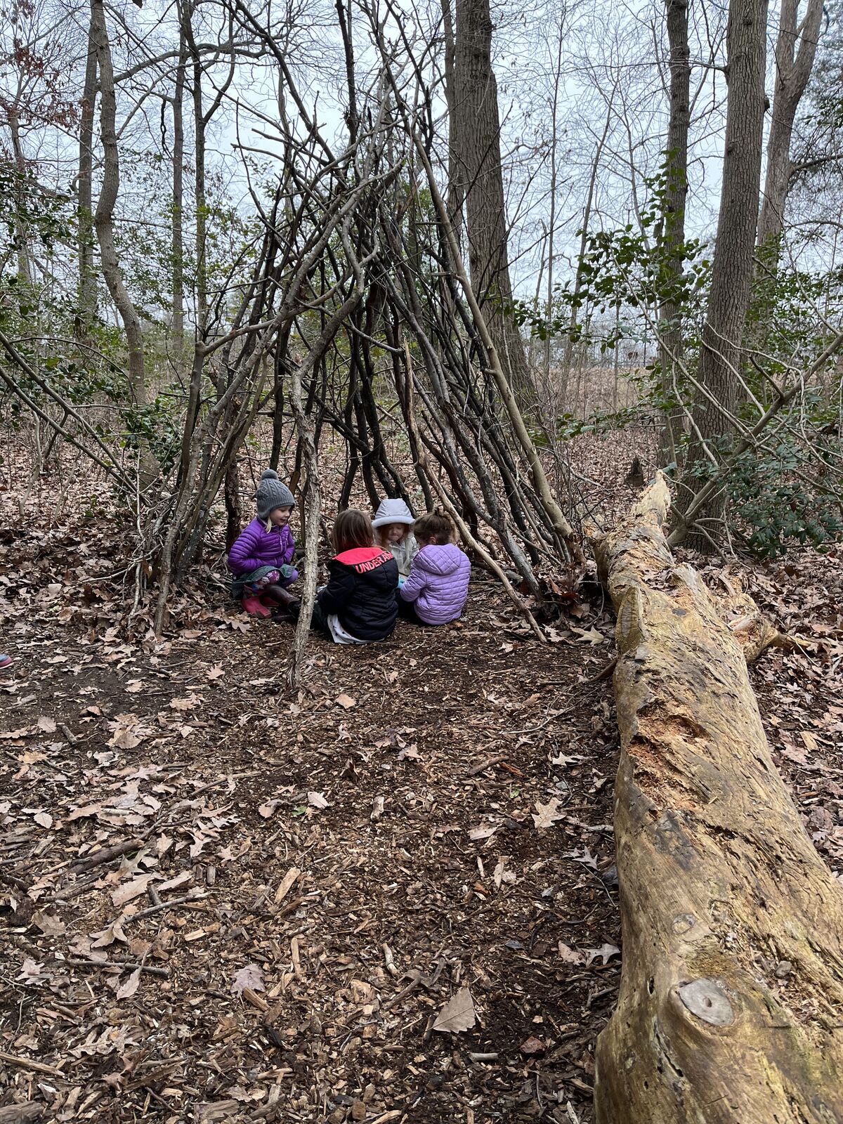Students from all classes continually add and update a play "house" towards the bottom of our trails. The structure was organically started by a Pre-K class in 2021. Safety checks and frame reinforcements are done by parents and teachers when needed, but overall design, construction, and use is child driven.
